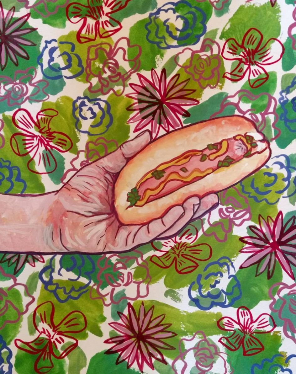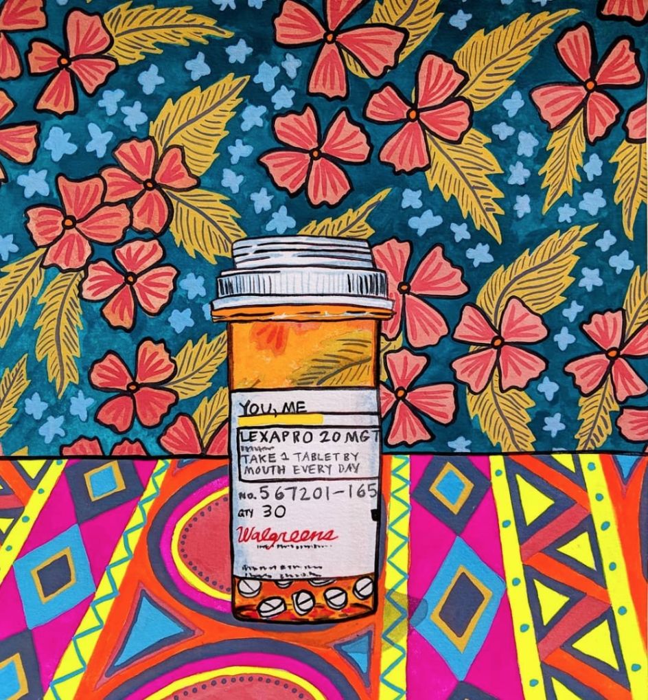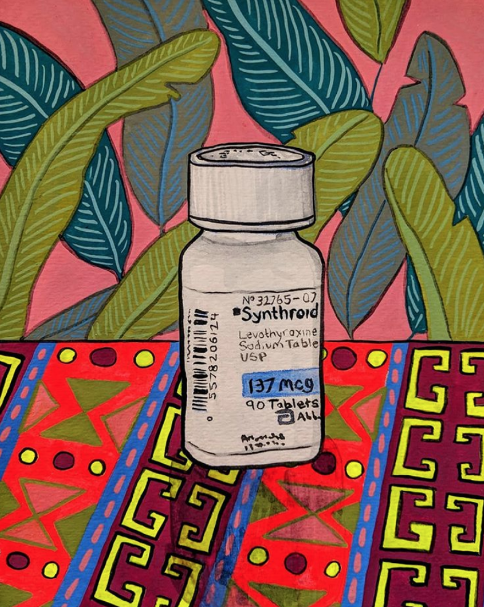 Her latest work is all portraiture of beloved TV personalities, medicine, food, and artists eating food. Each piece is really pattern-heavy and is full of bright colours. All the work is gouache on paper. The common thread is, really, capturing and celebrating what helps us," Joan adds. "Salves, role models, familiar comforts. The medicine portraits are also celebrating the idea of taking care of yourself and also celebrating the medications themselves that help people who need to take them to function; the destigmatisation of that.