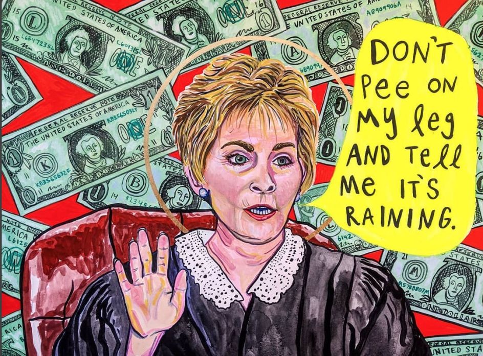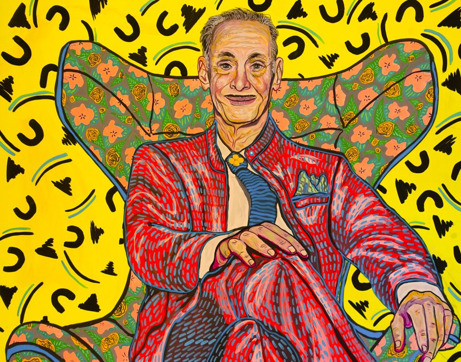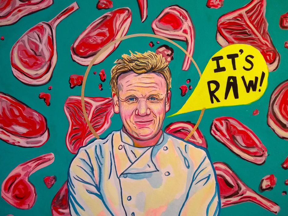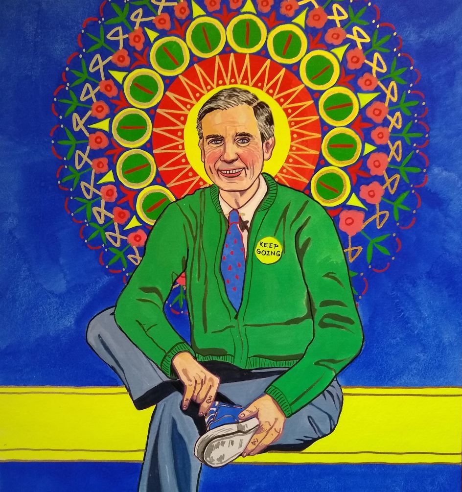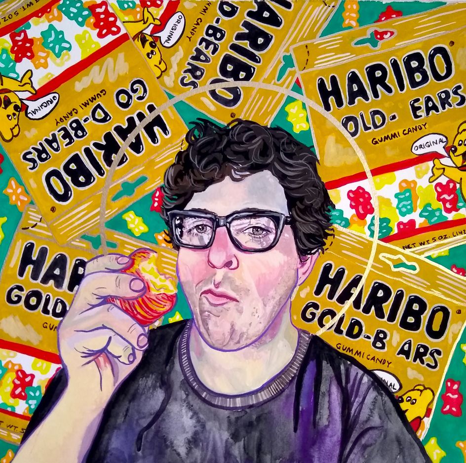 Her latest work is all portraiture of beloved TV personalities, medicine, food, and artists eating food. Each piece is really pattern-heavy and is full of bright colours. All the work is gouache on paper. The common thread is, really, capturing and celebrating what helps us," Joan adds. "Salves, role models, familiar comforts. The medicine portraits are also celebrating the idea of taking care of yourself and also celebrating the medications themselves that help people who need to take them to function; the destigmatisation of that.