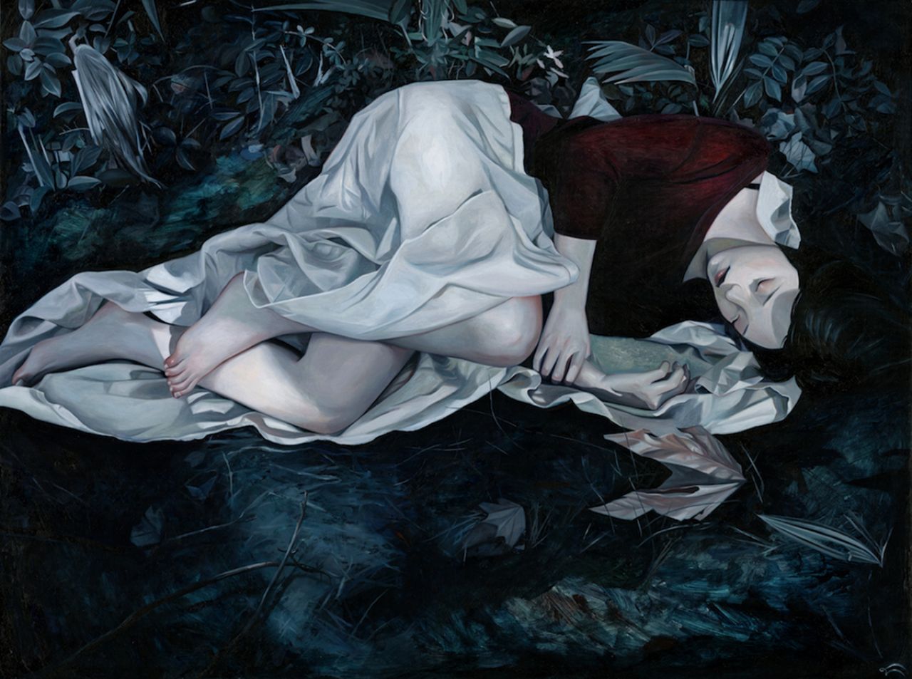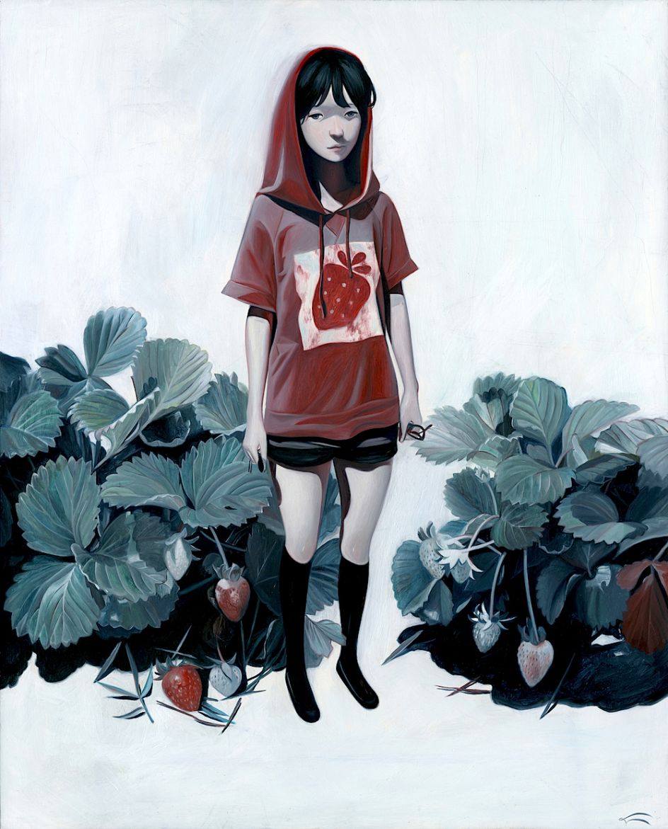 Her 'oil on wood' artworks feature soft coloured girls, posing awkwardly in various forest settings, suggesting that they might be lost in the woods, foraging for themselves and somehow surviving.