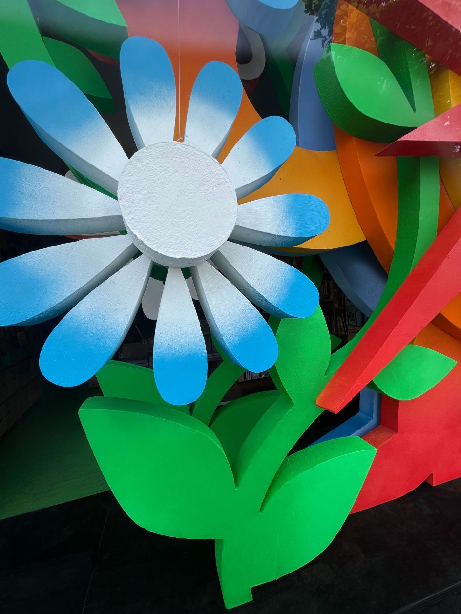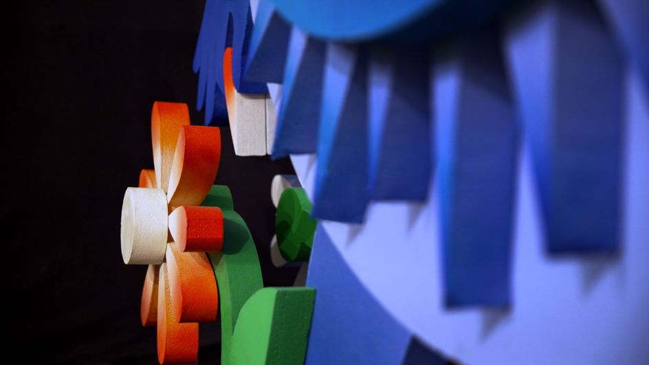 She explains the thinking behind her 8'x12' installation, entitled Work & Play. "On one side, the sun represents the spirit of the noonday demon – listlessness and pressures often associated with creativity during daylight hours," she says. "Depicted shedding a tear of anguish, snipping a flower, and plucking a petal, the sun embodies hindrances to creative growth.