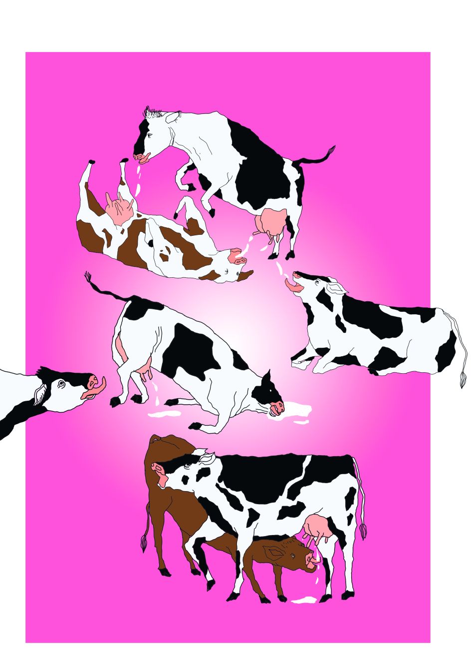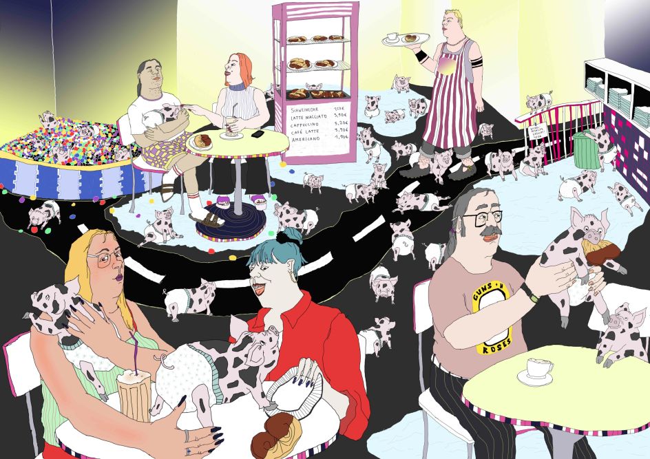 Looking closely at the often absurd narratives in her work, like a lively pig cafe, joyful cows drinking milk or some kind of 'dress like a tiger' party, Ploch's illustrations also remind us to not take life too seriously. "Enjoy yourself, be exactly who you are, don't take yourself too seriously and do exactly what you want and accept when other people do that too," she says. "And trust in your process!"