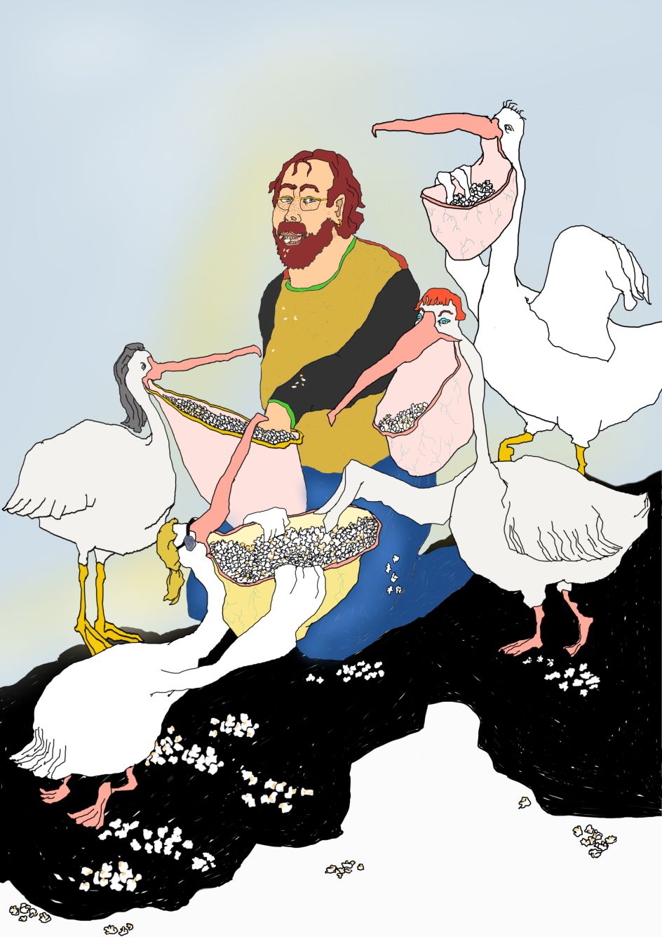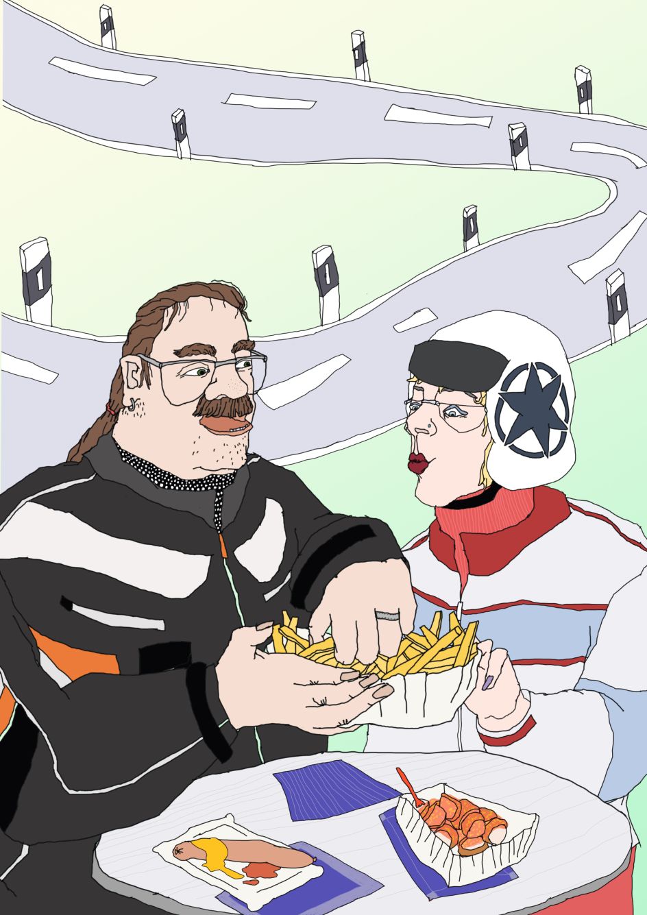 "I would say my work is driven by the feeling I can get myself into when drawing," Ploch continues. "I love searching for the characters in my mind while I draw them. And that works in very individual circumstances. With the right music, for example. Sometimes a character doesn't get good until I hear the same song twenty times. Because I imagine that he is celebrating exactly this song right. For instance, when I was doing the illustration with the two bikers taking a break and eating fries, I listened to the song 'Highwaystar' by Deep Purple quite often. I haven't been able to hear it since then either without thinking of the two."