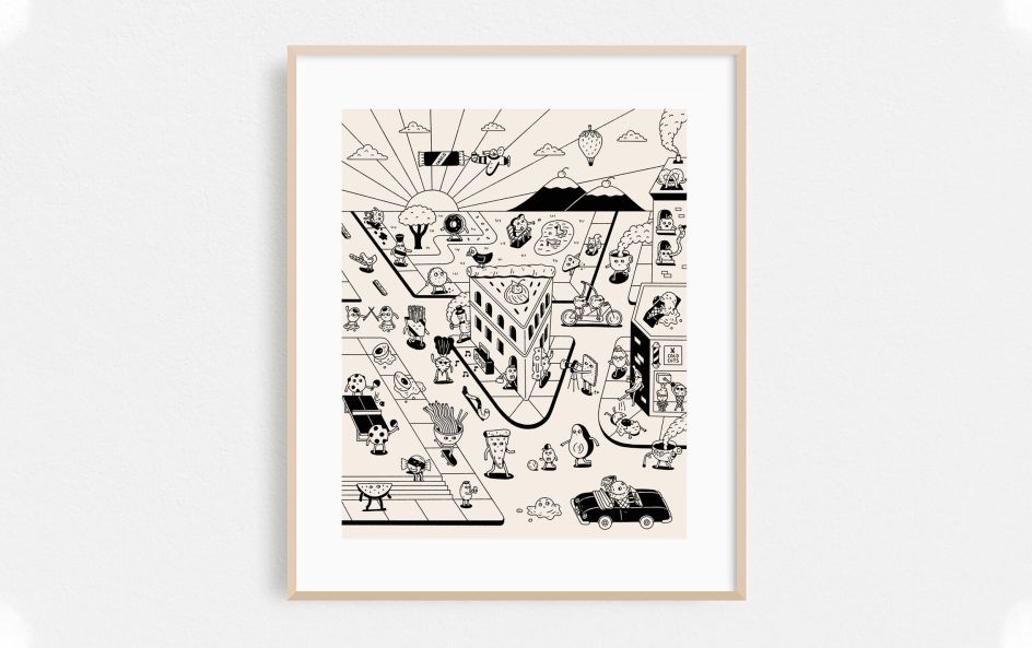 I'm a constant snacker, I'm always hungry, and I love food. Inspired by this, I created a detailed illustration and art print titled Hungrytown. It incorporates all of the silly inanimate food characters that I love to draw in one landscape. It has a number of Easter eggs hidden in the scene, like the New York Flatiron building turned into a pie, two cookies playing ping pong with one of their chocolate chips, and a banana tripping an egg character on the sidewalk.