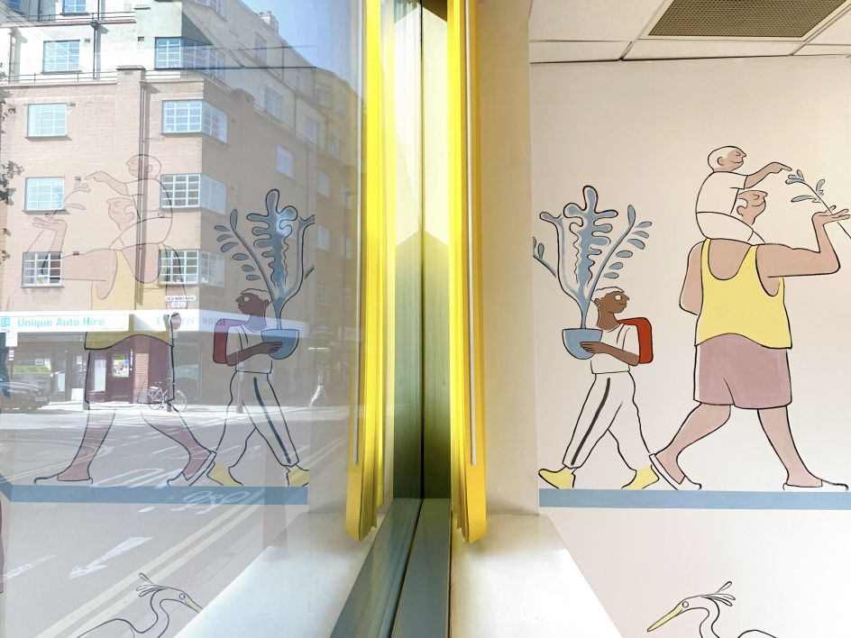 London-based illustrator Jonny Glover has created a new mural at the Children's Mental Health Centre, transforming an NHS waiting area into an uplifting, calm space that reflects the stories and lives of the young people who use the service.