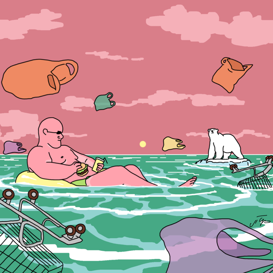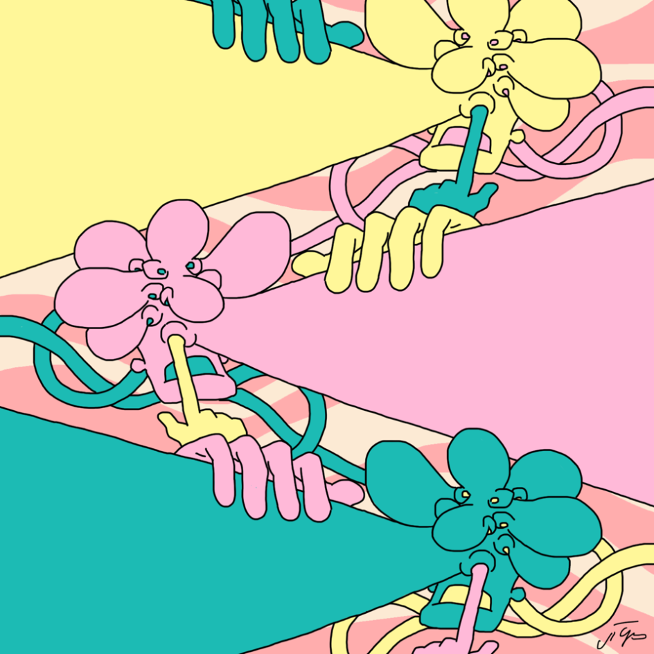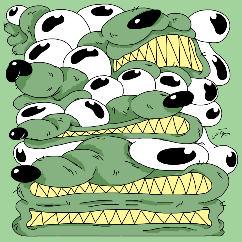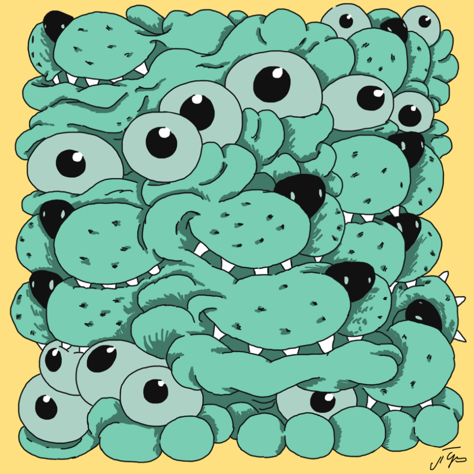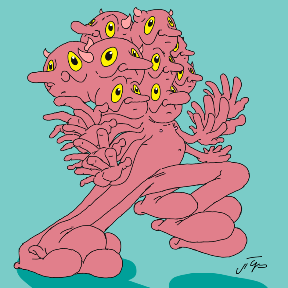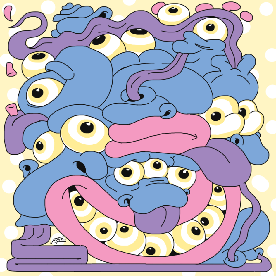 The illustrated world of Josh Richardson, known online under the pseudonym Grich, feels like something has been warped and corrupted in the best way possible. His illustrations feature multi-headed devils wrestling with multiple limbs, a consumer drifting through the desolate, plastic bag strews sea of their own greed and abstract creatures whose facial features have descended into a gloriously chaotic heap.