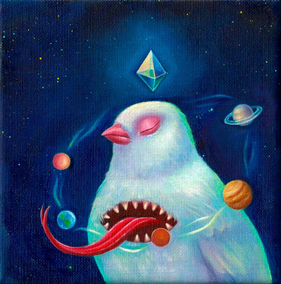 "Birds play an important part in nature, so in my paintings, they can control the world and learn much more than humans. At the same time, they take on human traits – sometimes vices, they have the same eyes as a girl character in my other paintings."