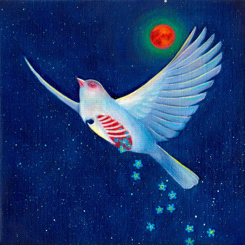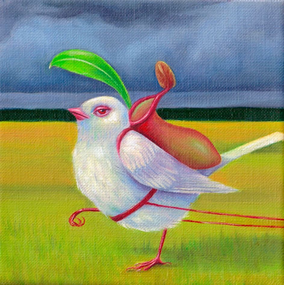 Like many things in the world, size doesn't necessarily matter when it comes to art. Take the tiny bird paintings by Julia Kuzina, which measure less than six inches square. Yet within the confines of these tiny canvases, she creates beautifully bizarre worlds where birds hunt with needles, hitch a ride in a shell, and even wear a skull for a crown.