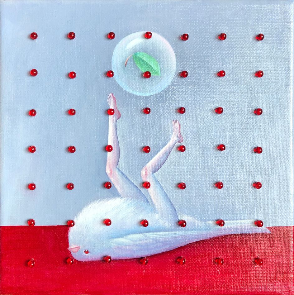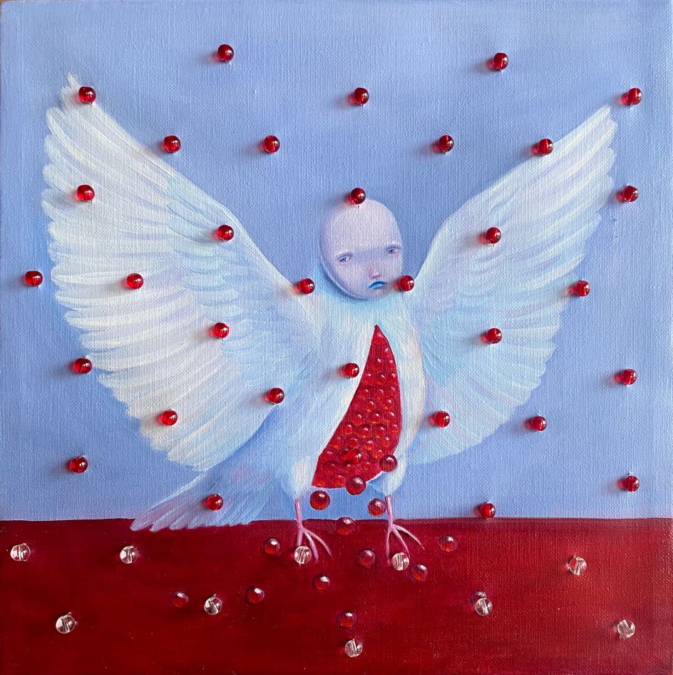 Another way that Julia gets her emotions across is by immersing her viewers in the plot of her paintings. Her bird series is a prime example of this, as she attaches cranberry-red beads to the surface of her miniature canvasses. "These beads are a connection between the physical world of the viewer and the fantastic world of the painting," she reveals. "They belong to both worlds."