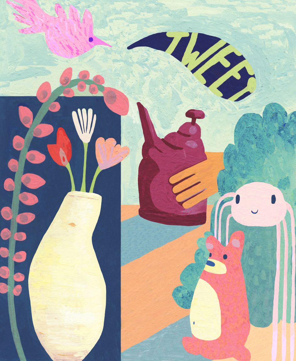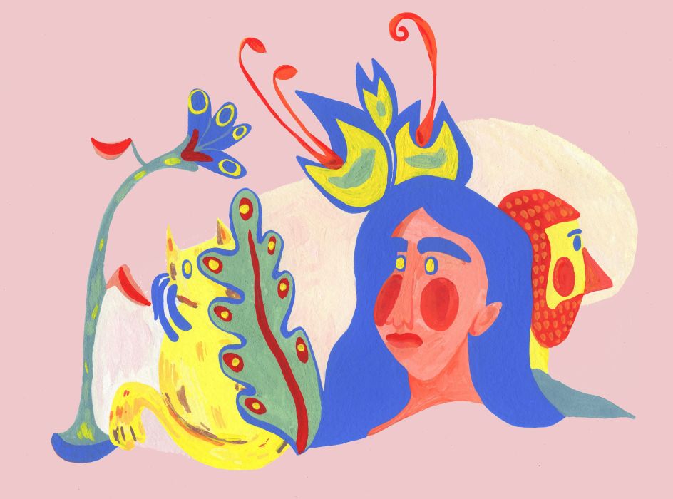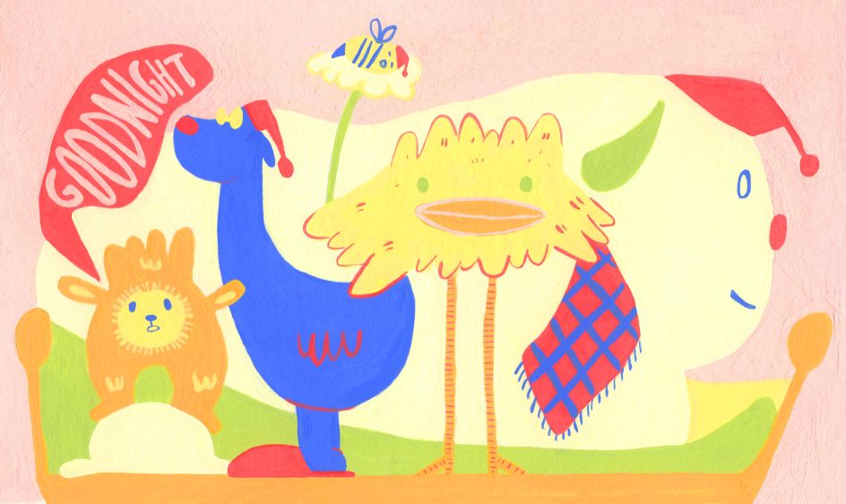 Kat's vibrant colours, movement of line and shape evoke the gamut from humour to frustration, an absurdity to love. Her personal work shows characters experiencing banal situations which "literally warp them", or animal-like characters displaying different human quirks.