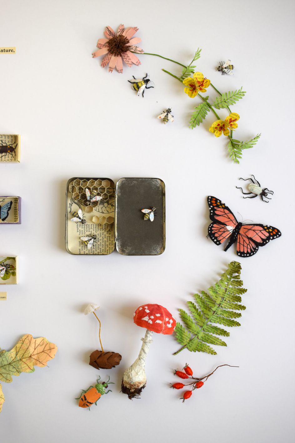 "As a child I spent a lot of time collecting bits and pieces in tins or boxes, which I would take with me on walks through parks or countryside. This has had a huge influence on my work along with my love of botanical illustrations, the natural sciences and the nostalgia of museum visits where, as a child, I would be mesmerised by the variety of exhibits and the way they were displayed. I tend to view my work as a 3D record of my knowledge and experiences of the natural world."