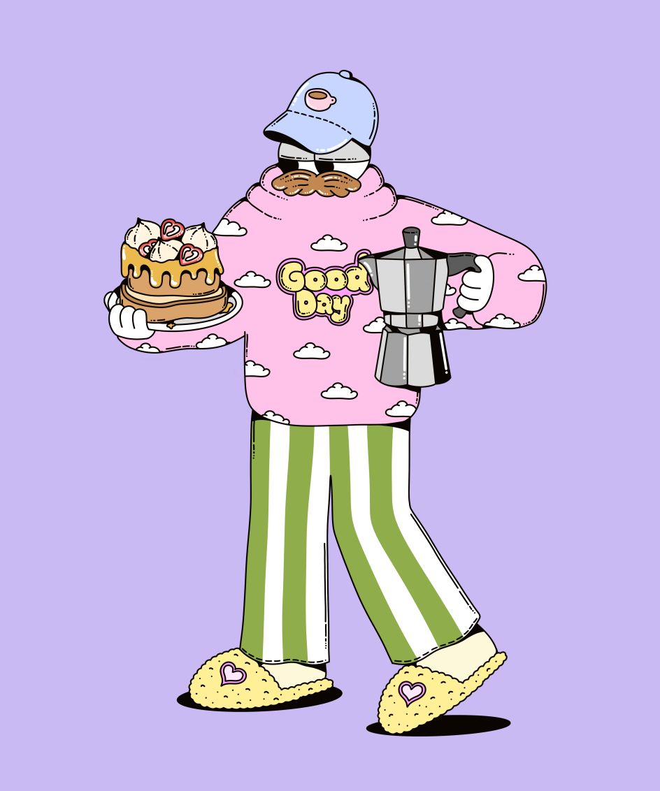 "Retro patterns and colours also inspire a lot of my illustrations. There's something about the deep, warm tones and cool colours that work so well together and alongside expressive patterns. Food and drink is also a theme in most of my designs, as food is a comfort and satisfying to draw. I get inspired when eating in cafes or restaurants, whether it's a classic brunch, coffee and cake, or pancakes drenched in syrup."
