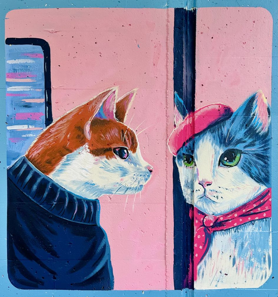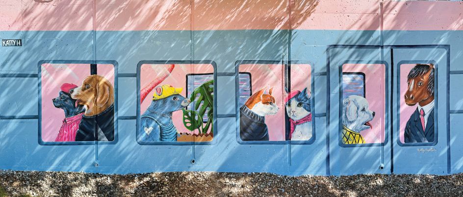 Seeing as the wall for the mural was right under a train line, Katty wanted to create a mirror with her work, yet one where the imaginary train and the real-world carriages align. "I love world-building, and in my head, I was building stories for these animals," she says. "The rat, in some ways, represents me; she's just come from a grocery store with the essentials and a plant. If you look closely, her necklace says 'Katty'.