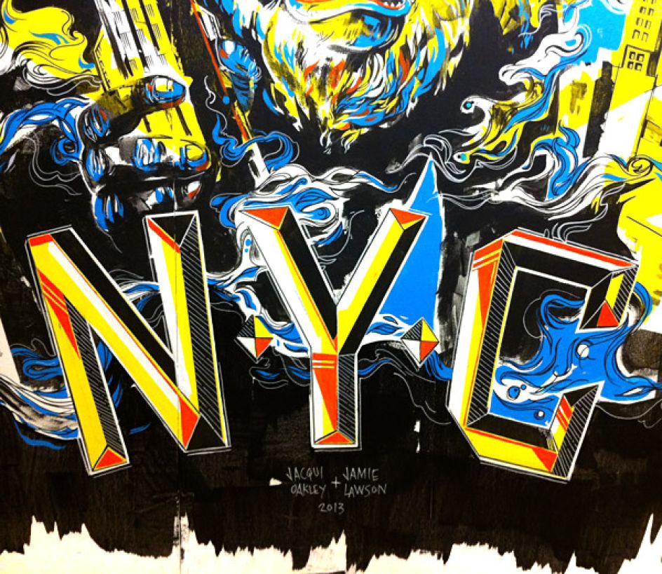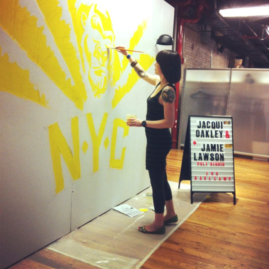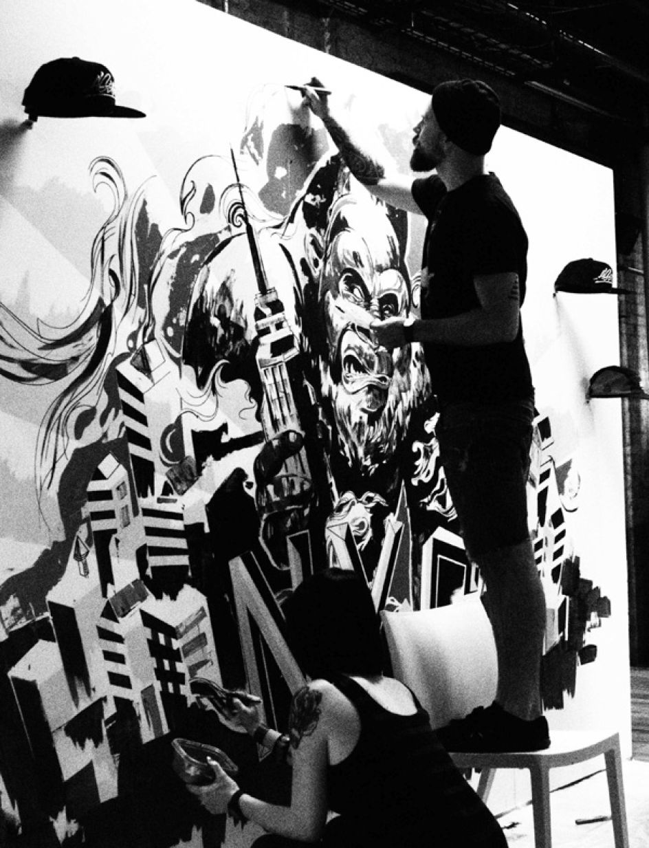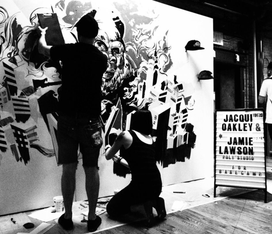 Jacqui Oakley and her husband, Jamie Lawson from Poly Studio were recently flown down to New York by Basecamp and Flexfit to do a mural for the Agenda NYC trade show. It's a forum for street wear lines such as Brixton, Reebok, Herschel and Vans - with a strong emphasis on style, art, music and culture.