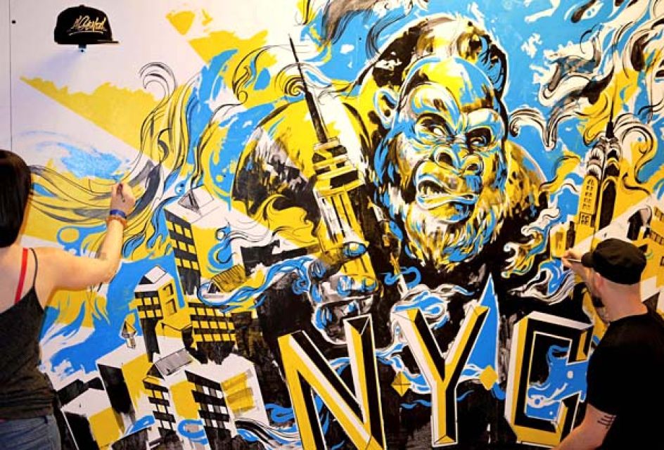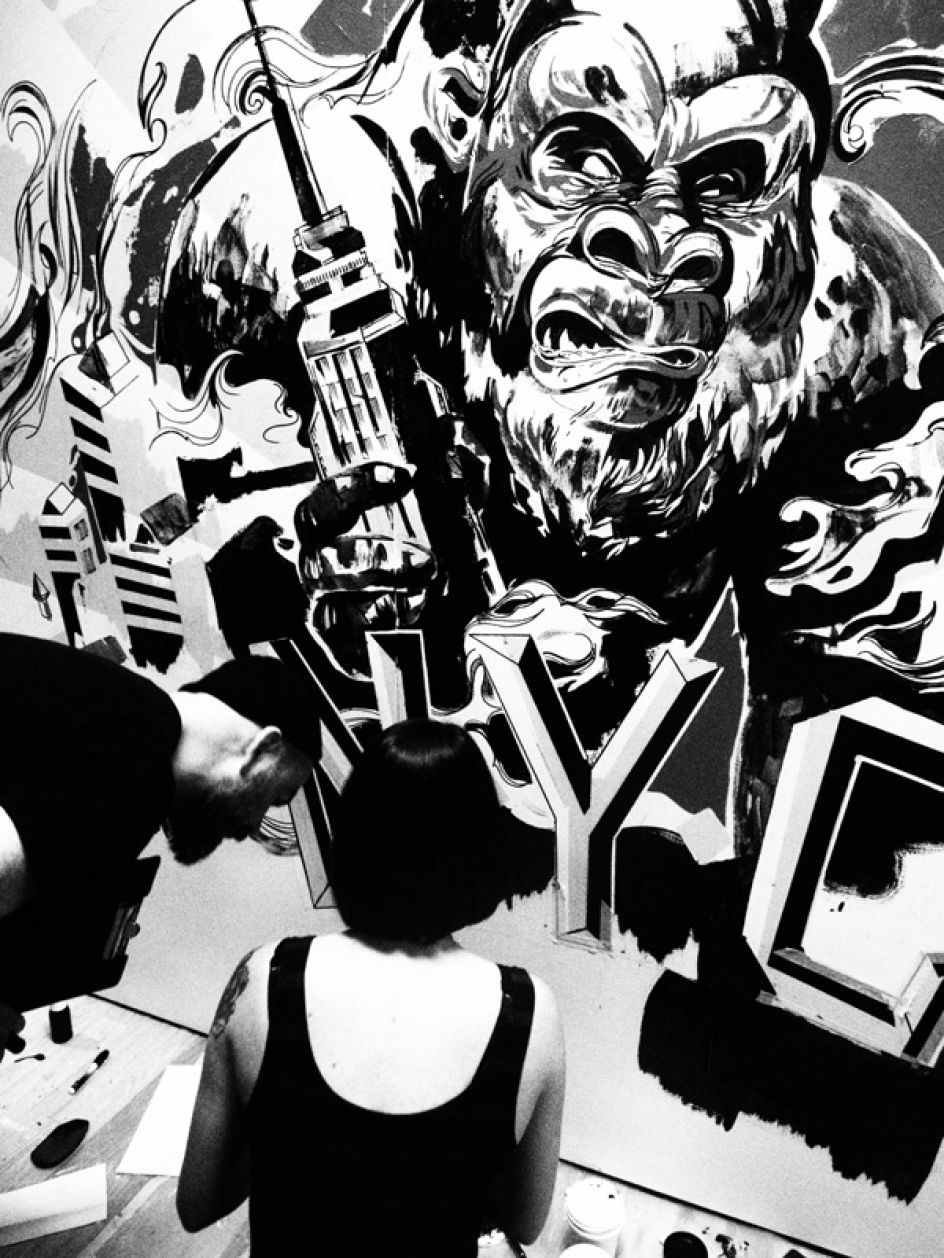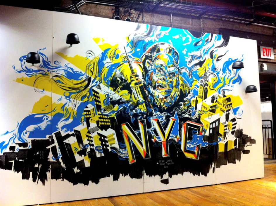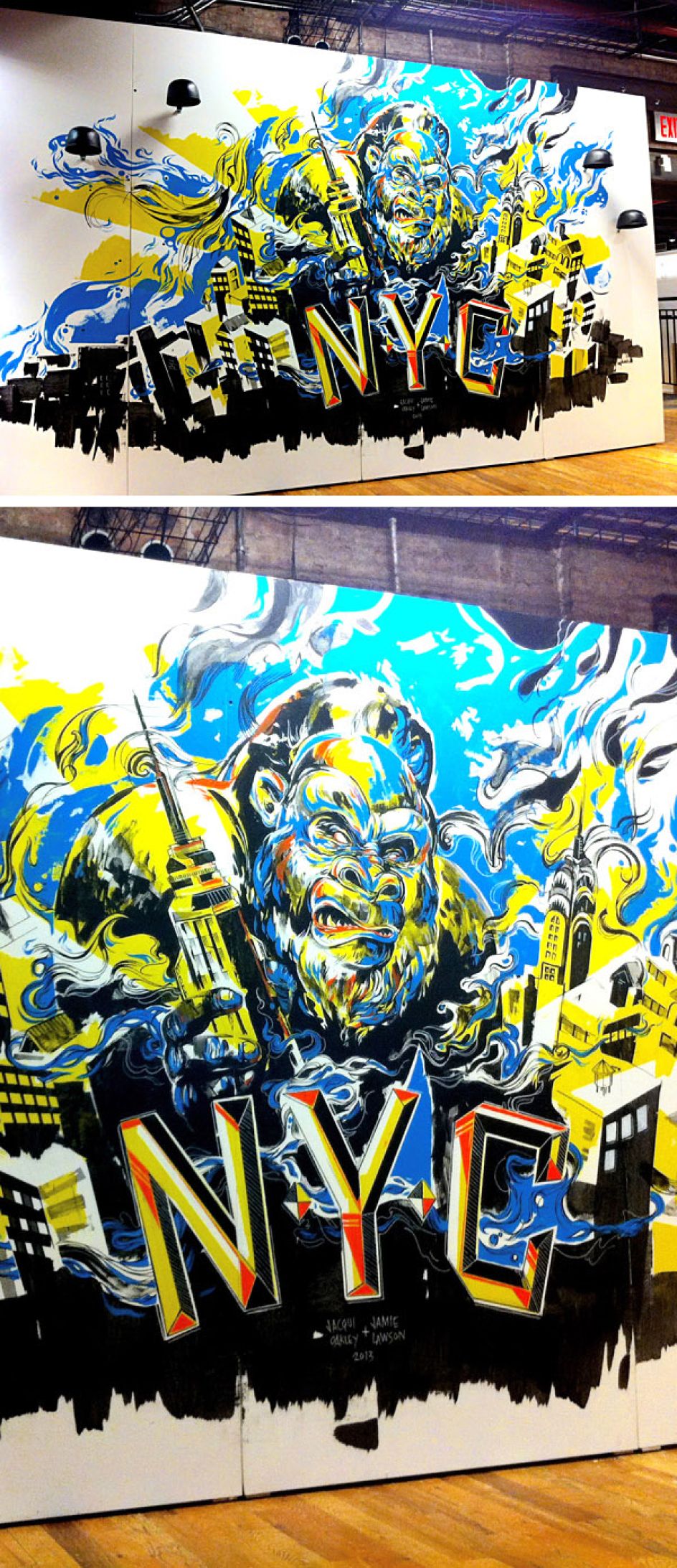 They were given a big 12×8′ freestanding wall and kindly had free reign to play with a New York theme, so of course they came up with a huge King Kong painting. Here's a lovely bunch of images to see their work in progress, along with an ever-so-satisfying time-lapse video for all you wonderful creatives. Enjoy!