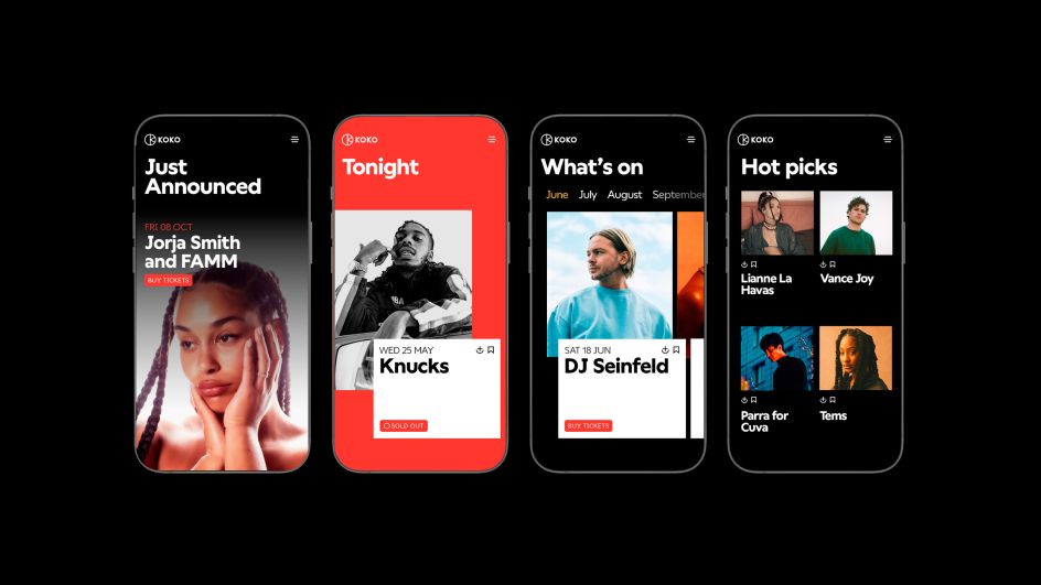 At the heart of the design system, which includes a dynamically animated logo and an unmissable colour palette, is the concept: 'Countdown to Live'. The idea behind this slogan is to bottle the anticipation, energy, and unique thrill of live events and KOKO's ability to beam this excitement worldwide via streamed performances, podcasts, and exclusive back-stage content.