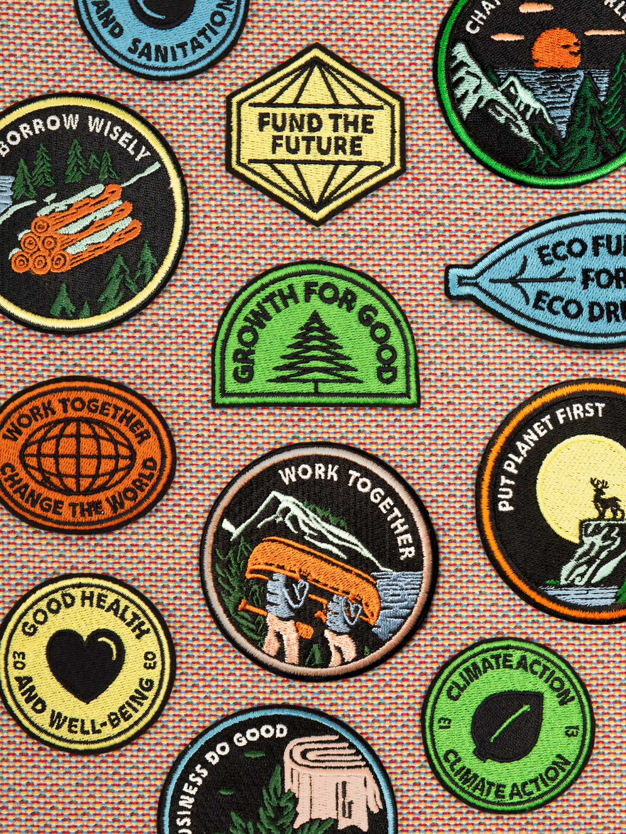 Central to Kikin's brand are the badges and illustrations inspired by outdoor and adventure clubs. The badges represent shared goals and values, grouped into three tiers – the top being based on the five Kikin commandments, at the core of everything the company does; the second being typographic-led brand messaging badges used to communicate Kikin's purpose, setting the tone across marketing materials, and the third featuring seventeen re-illustrated United Nations ESG goals, mainly used in the product experience.