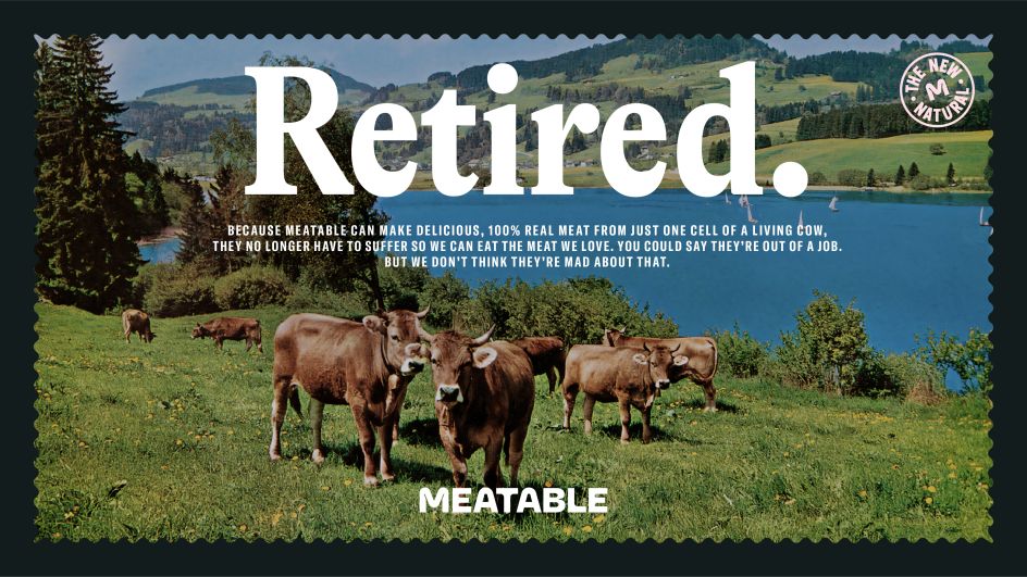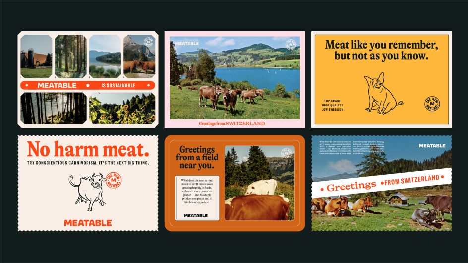 "Our brand imagines a world where cows are freed from factory farming. And with that strong idea in mind, we started thinking that 'without the need to kill animals anymore, they could go back into the fields and retire in peace'. We started referencing vintage holiday postcards, with cows grazing happily in fields and on mountains. It gave us a strong starting point to express what Meatable does distinctively and unexpectedly."