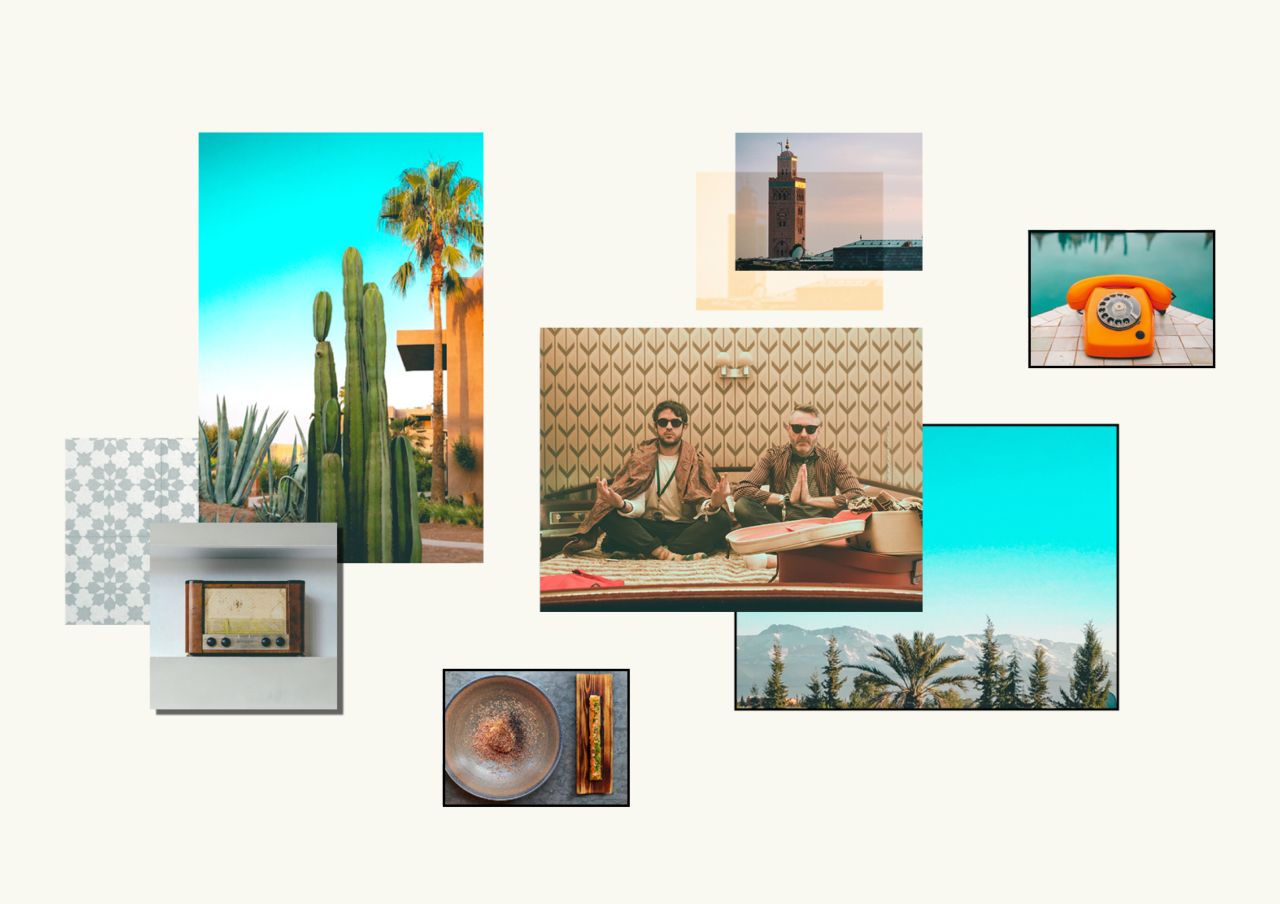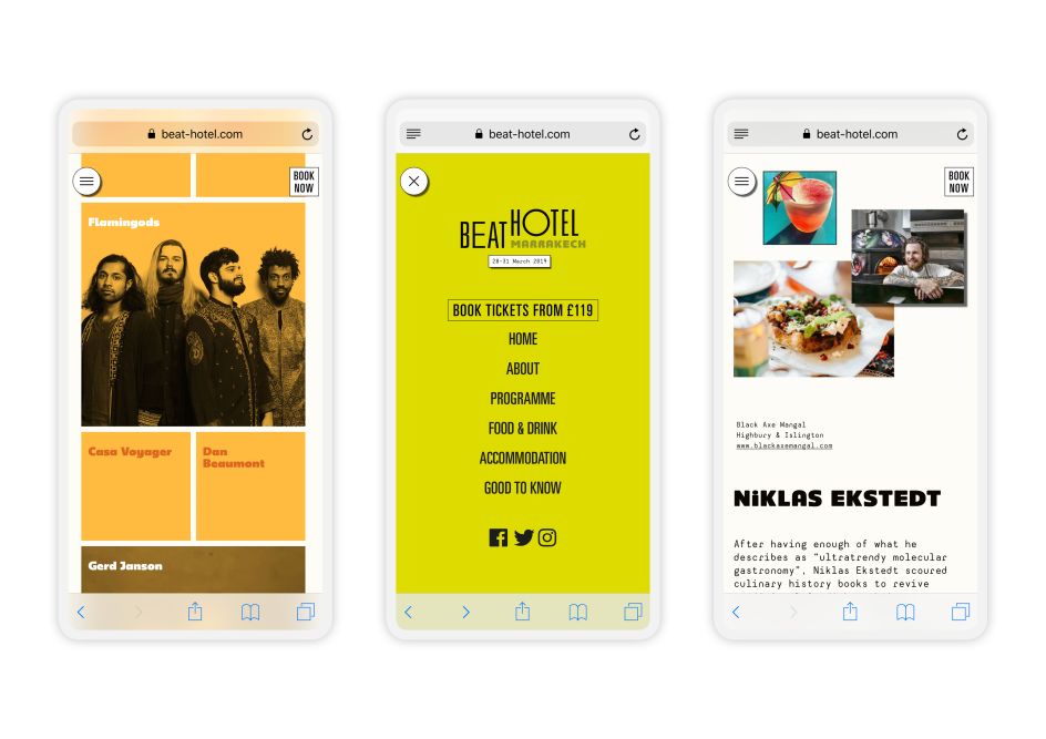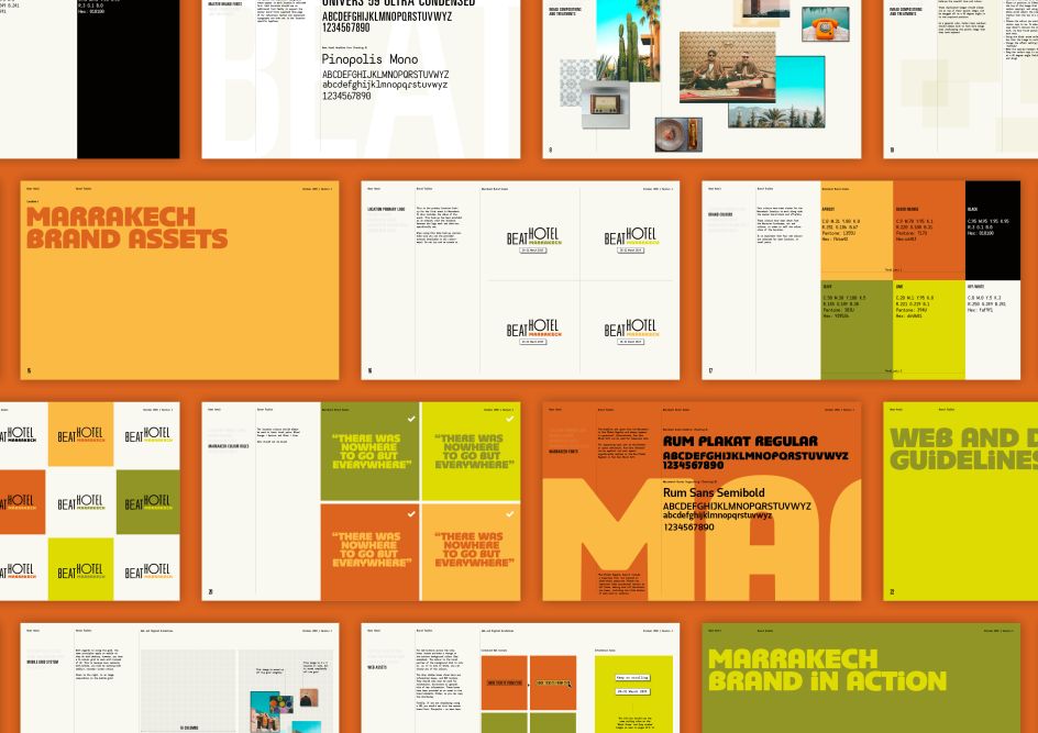 The secondary colour palette, headline typography and image selection meanwhile, reference the location, with rich, earthy tones, and Plaket, a typeface that takes cues from the original hand-painted sign of the TANGERINN, a Moroccan bolthole of the original Beats.