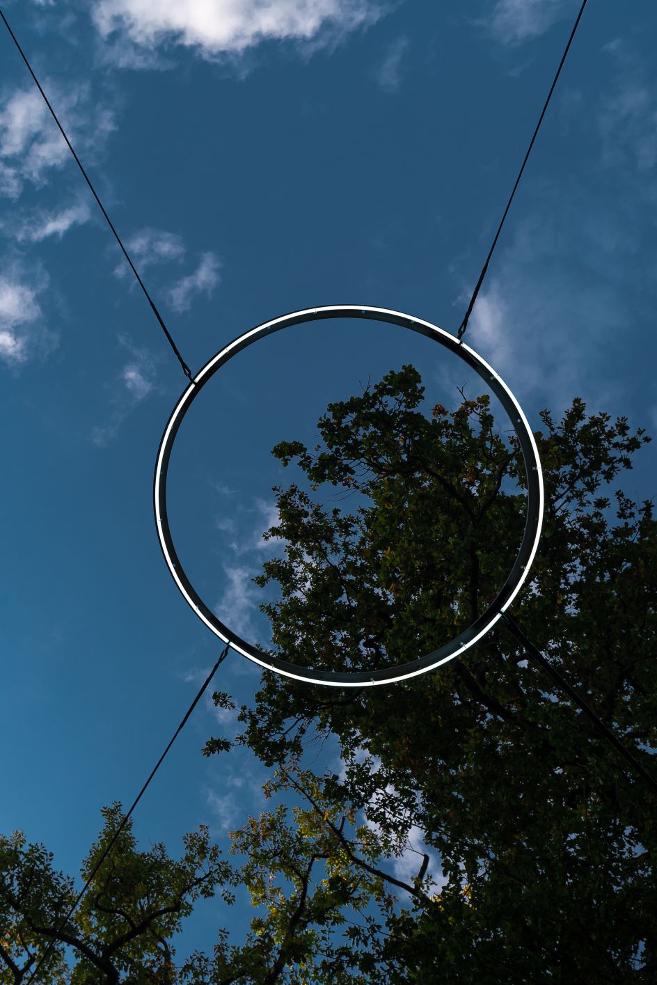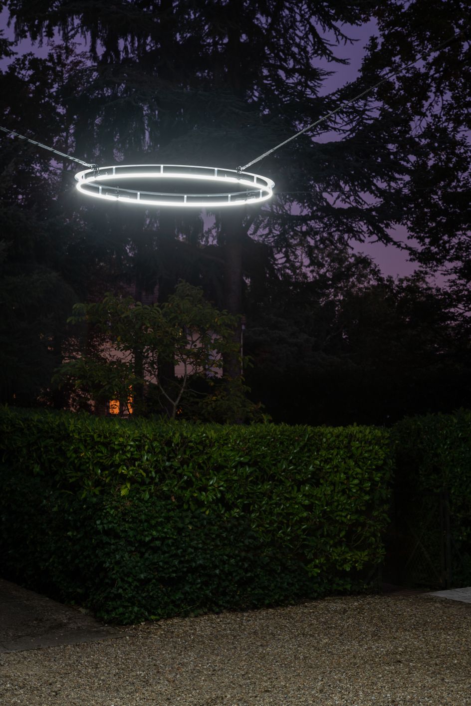 The ring itself was made by artist metalworkers Dunod Mallier, and the steel itself is a compound that allows for the best balance of lightness and resilience. Craftsmen glass blowers Vito Enseignes made the filiform neon tubes which were subtly inserted into the metal band in four parts, while C&E Ingénierie analysed the distribution of forces so LE SAINT could be safely hung in the trees at a height of three meters.