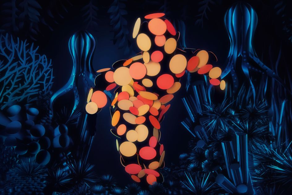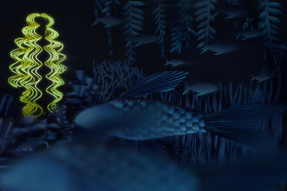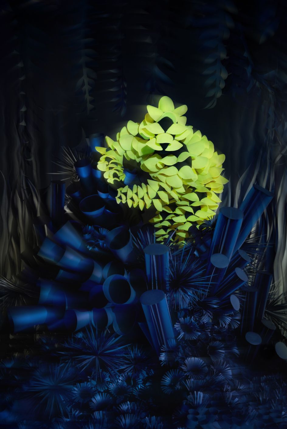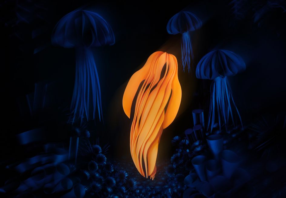 The team spent a long time discussing who these creatures were and where they might live. They eventually settled on the concept of strange, deep-water animals living in a dark ocean space where they illuminated everything around them; a world that Kazarova ended up creating entirely with black paper.