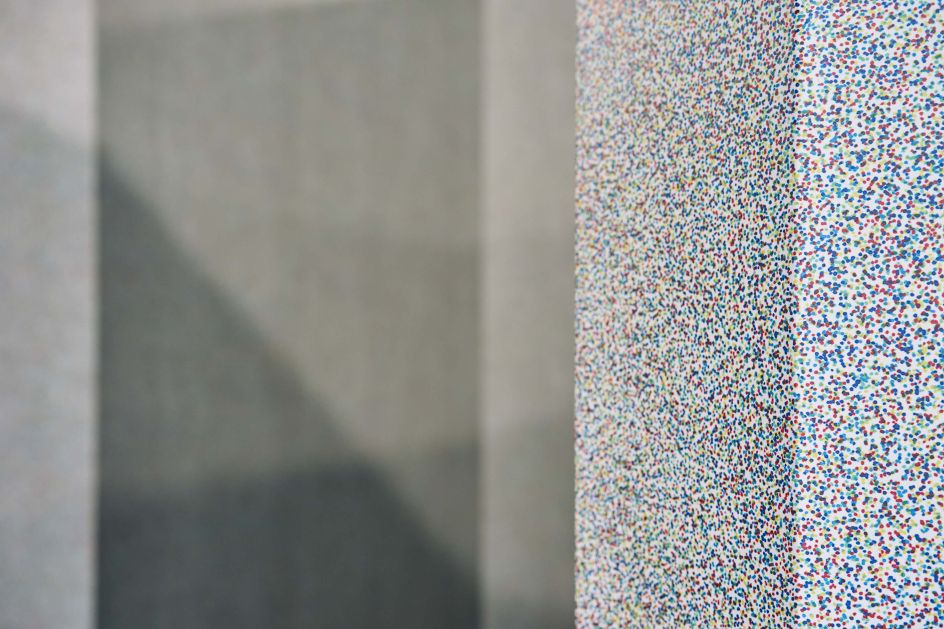 The standard test for superior shade discretion, the Farnsworth Munsell 100 Hue Colour Vision Test, is essential to Graham & Brown, with specialist staff requiring a superior score. After taking the test, and achieving superior colour vision, the artist took new ideas and long-term ambitions inspired by Josef Albers 1963 book, Interaction of Colour, to the drawing board and, after taking colour samples from the Cotton Exchange’s windows, took five pens at a time in her hand and ‘drew’ coloured dots on white paper.