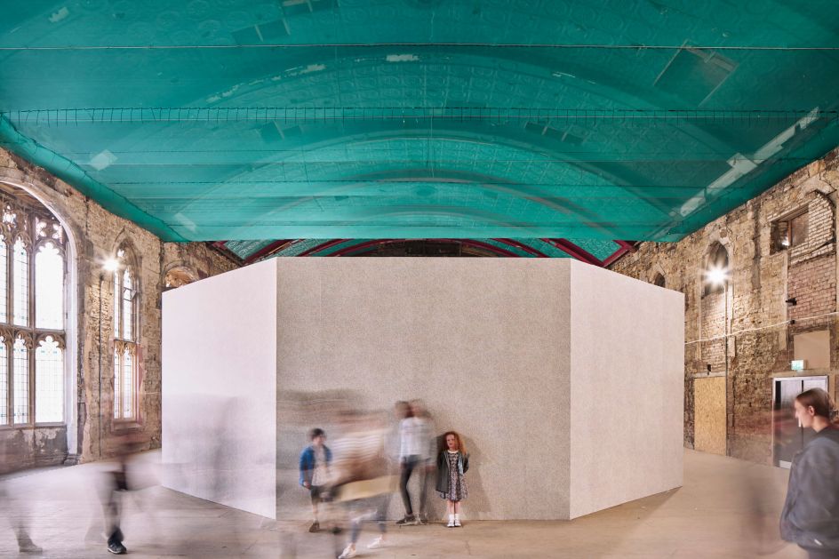 Testing build-ups of different combinations of colours, West eventually hit on the colour she had in mind – a true grey, only determinable from distance. Observing the repeated octagons in the Cotton Exchange’s ceiling design, the half octagons of the window bays and the octagonal shape of the foyer the shape of the final installation was determined by the building itself.