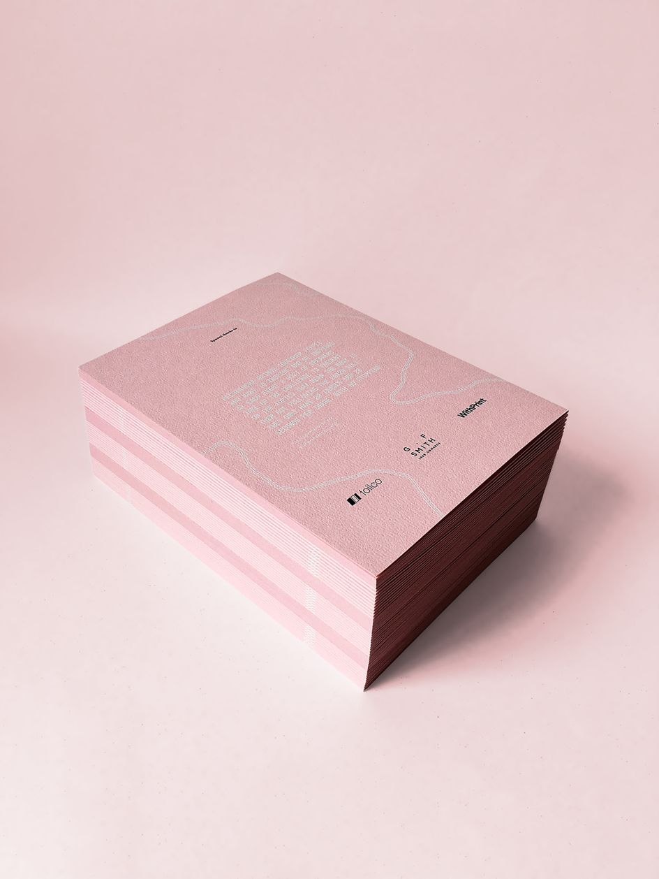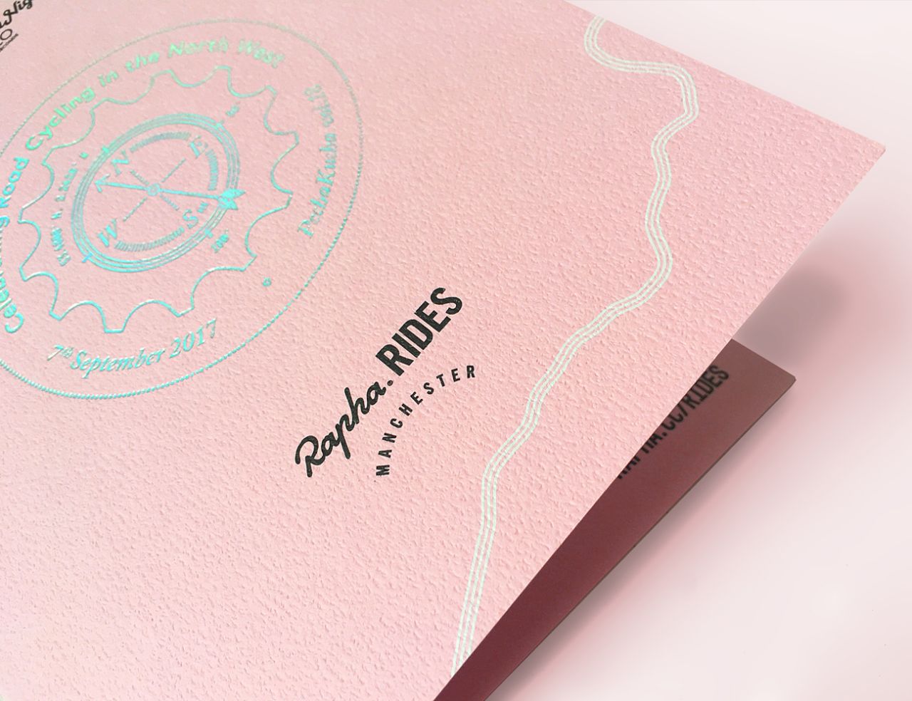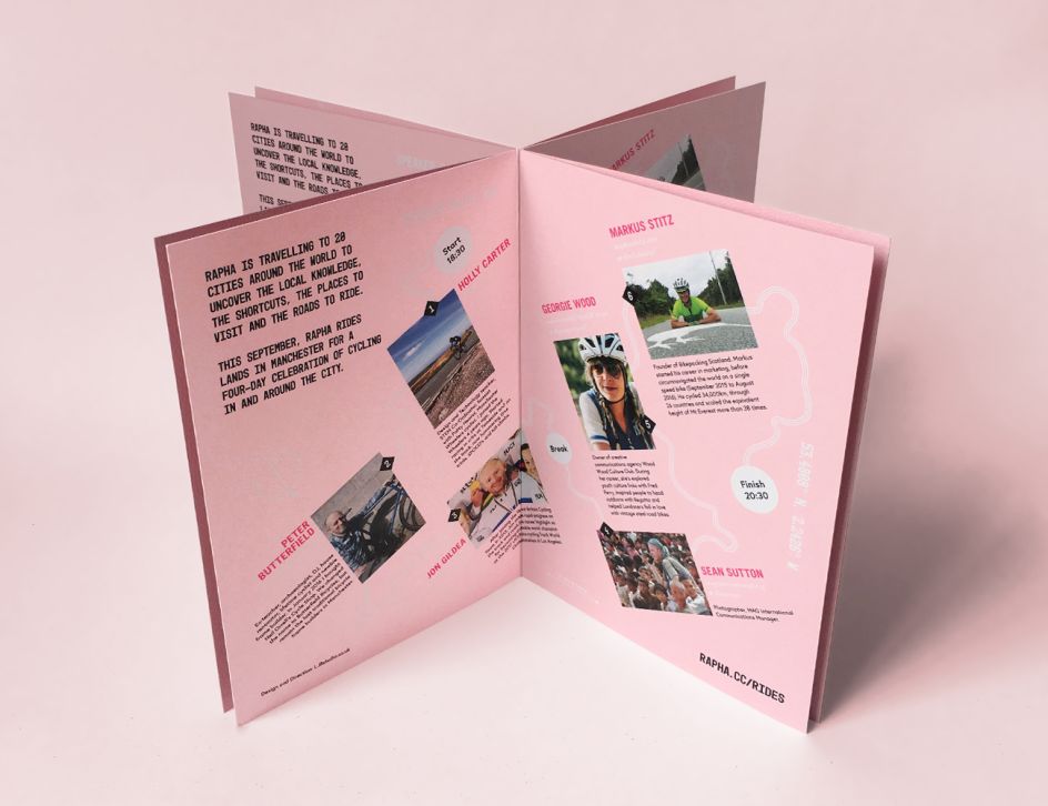 To strengthen the road cycling theme, LJB Studio specified G.F Smith’s ‘Granular Embossed ColorPlan’ paper stock to imitate the texture of tarmac and ‘Candy Pink’ to connect with Rapha’s brand colour palette.