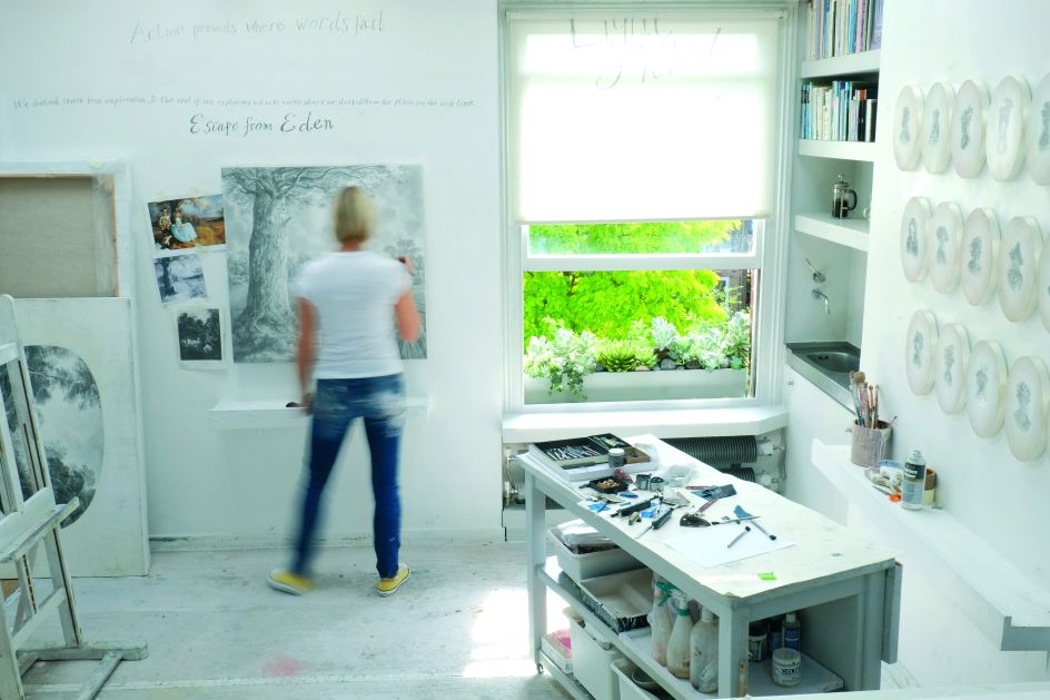 High in the roof space of an Edwardian terrace in London, overlooking a typically beautiful city park, you'll find British artist Sue Williams A'Court, happily working away, surrounded by her many paintbrushes and paint pots, paint in a rainbow of colour splattered all over the floor.