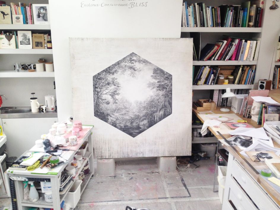 Working in painting, collage and drawing, she creates re-imagined landscapes, taking cues from classical references, but reinterpreting them in a new context and rendering them in graphite on a variety of surfaces.