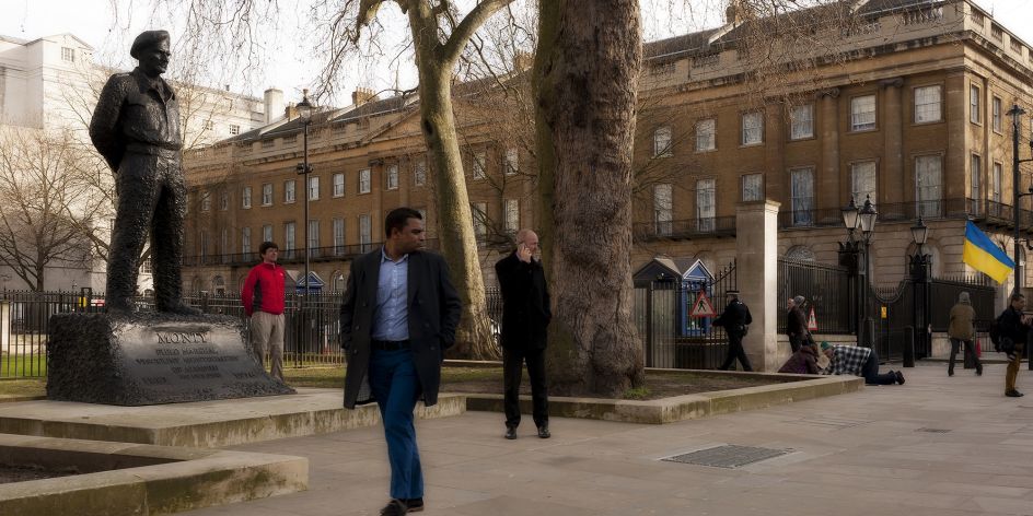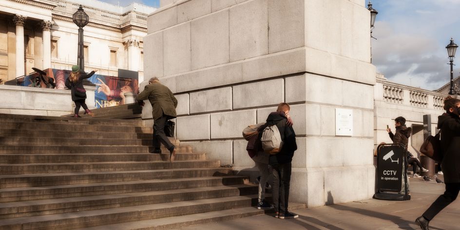 Grainger explains: "The French poet Charles Baudelaire wrote about the ghosts that the imagination meets on every street corner of Paris. The pictures in London Tableaux are traces that reveal the city's identity, and the formed tableau is the result, in part, of the imagination. To quote the photographer Jeff Wall 'One of art's greatest qualities is its presentation of the mystery of identity'. What interests me about this idea is the challenge of demonstrating the mystery of the city's identity in an urban tableau."