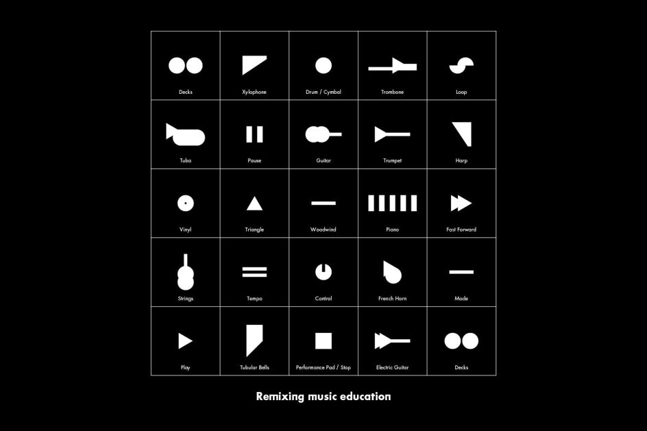 To communicate the fact that classical instruments are used to create digital music, and reinforce that a set of decks is a musical instrument in their own right, the team created a graphic language made from nine simple geometric shapes. The shapes combine and morph into various classical instruments and key digital symbols found on decks.