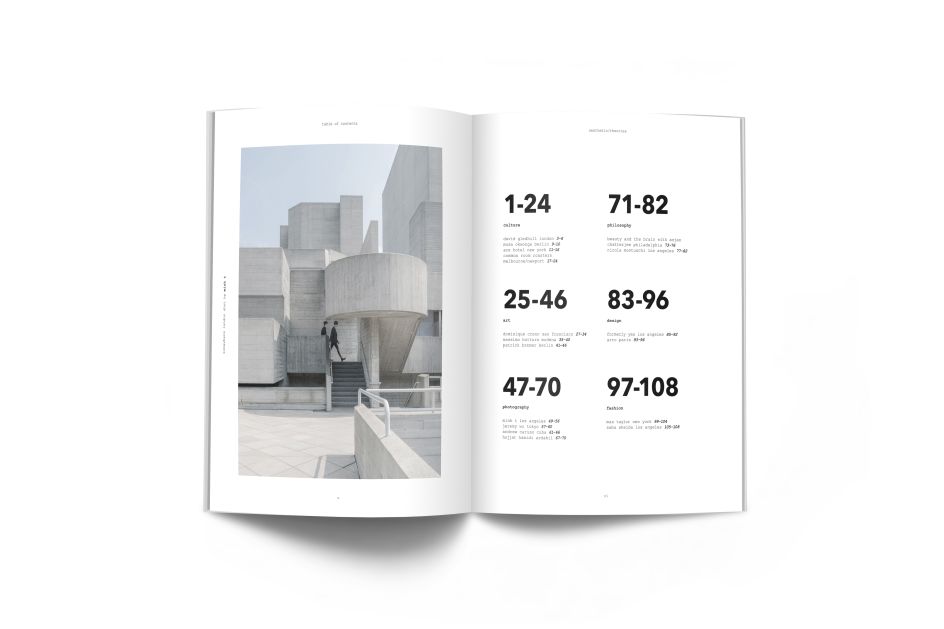 In this issue (clearly not struggling with the ‘difficult second album’ curse), the magazine broadly rails against what the editor-in-chief Samine Joudat describes as “a need for commodification that forces everything to become the same”. In practice, that means features including an interview with Ace Hotel New York’s chief brand officer Kelly Sawdon; a feature in which a Michelin-starred chef talks discusses culture and politics (and of course, food); a photo series about the lesser-known side of LA by Minh T; and a look at the same city’s brutalist buildings from architect Nicola Montuschi.