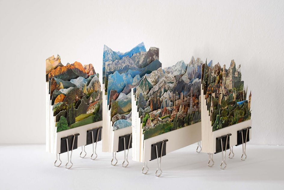 Italian artist Caterina Rossato creates unique 3D collages out of old postcards, where she layers together cut-out images and applies them to wood to form sculptures of beautiful landscapes from across the world.