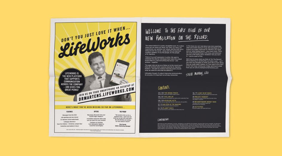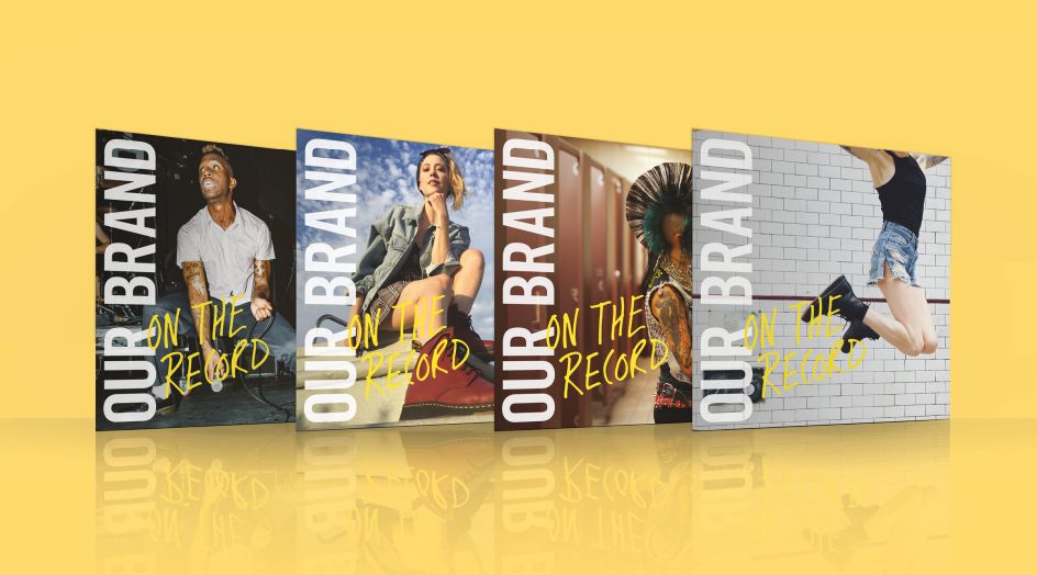 The collaboration will continue over the course of a year, with Music helping the brand talk to staff internally through designing items including an unusual take on the traditional brand book. Instead of a printed publication, Music designed a vinyl record packaged in four different sleeve designs with printed sleeve notes elaborating on the content of each record. These were distributed to Dr. Martens staff around the world.