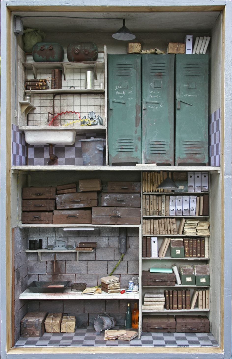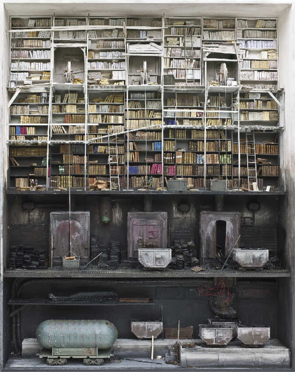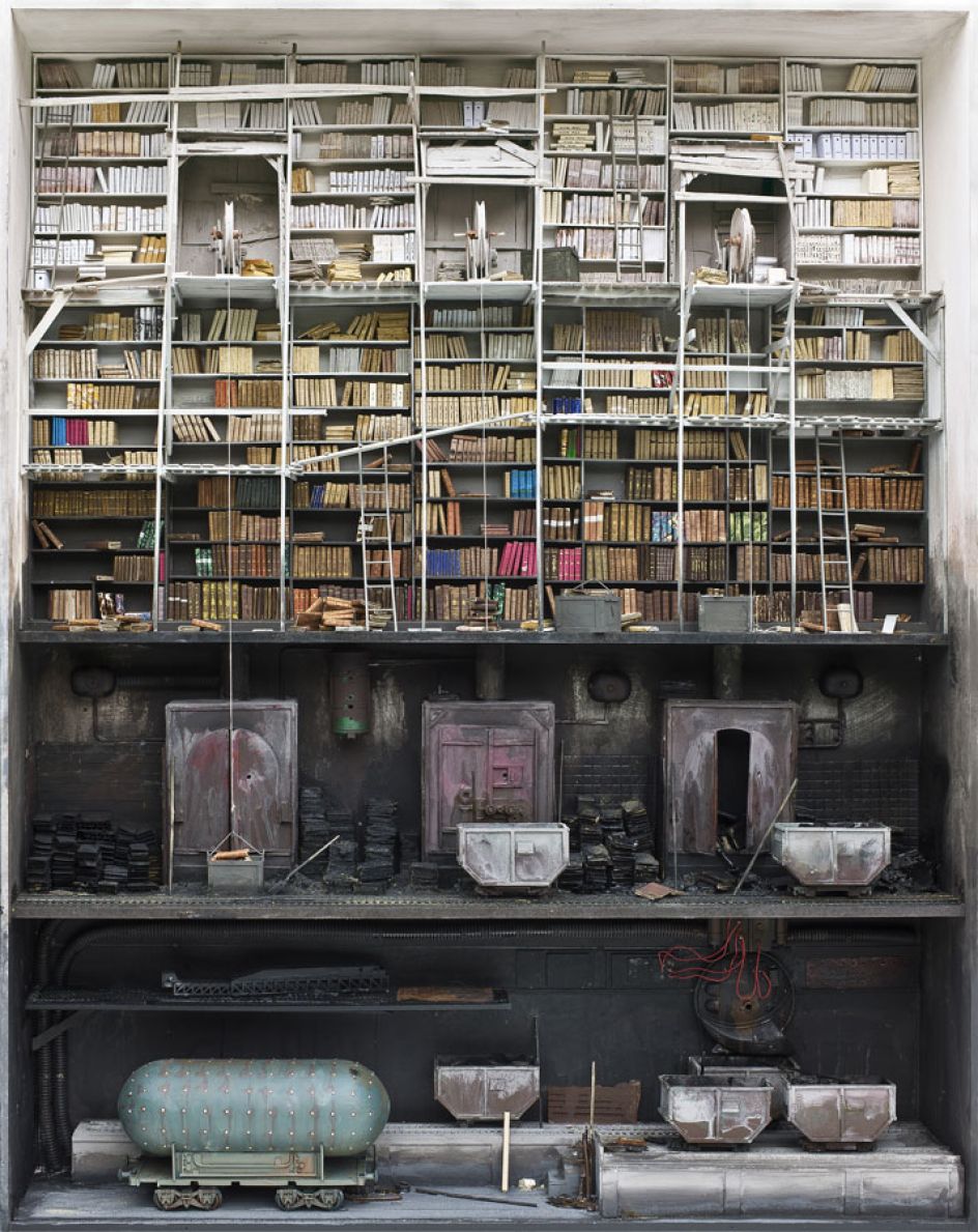 The sculptures in Théâtre de la Mémoire are reminiscent of meticulously detailed dollhouses. The artist refers to his diorama-like structures as “boxes” and they function similar to a theatrical stage, with one side open to reveal a multi-level, uninhabited building. Each floor contains subjects such as libraries overflowing with books, warehouses with rusty mechanical equipment, laboratories with abandoned experiments and basements covered in soot.