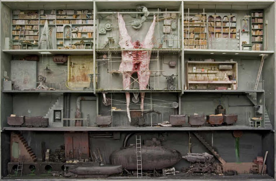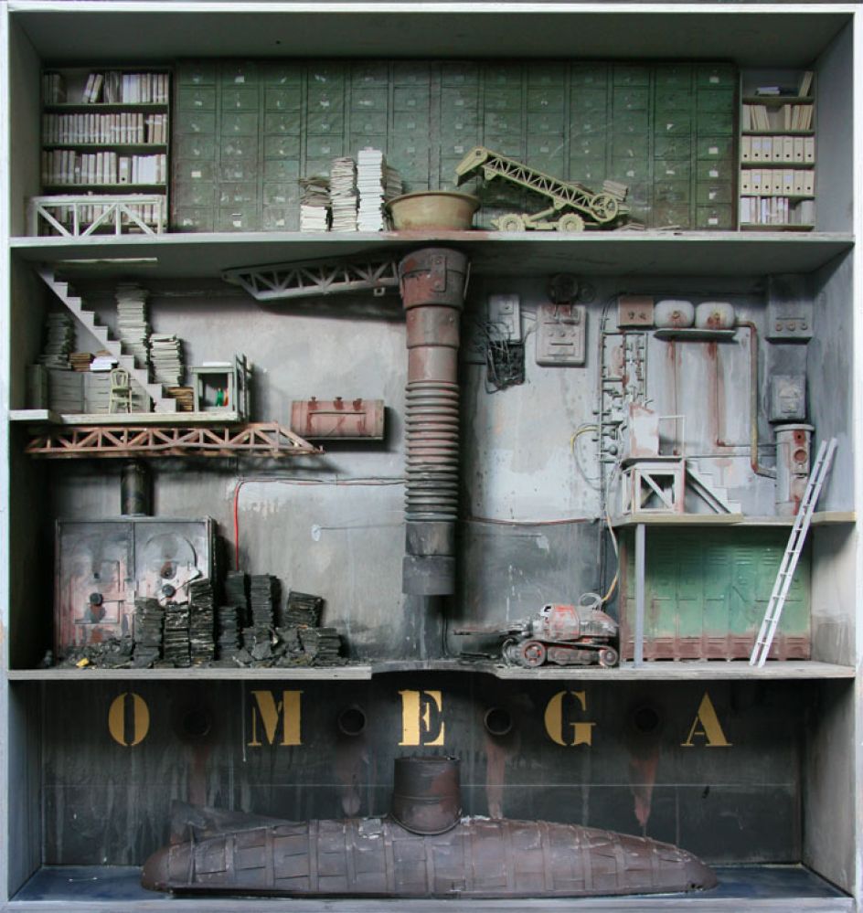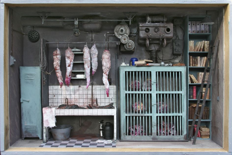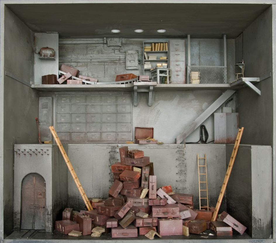 The sculptures in Théâtre de la Mémoire are reminiscent of meticulously detailed dollhouses. The artist refers to his diorama-like structures as “boxes” and they function similar to a theatrical stage, with one side open to reveal a multi-level, uninhabited building. Each floor contains subjects such as libraries overflowing with books, warehouses with rusty mechanical equipment, laboratories with abandoned experiments and basements covered in soot.