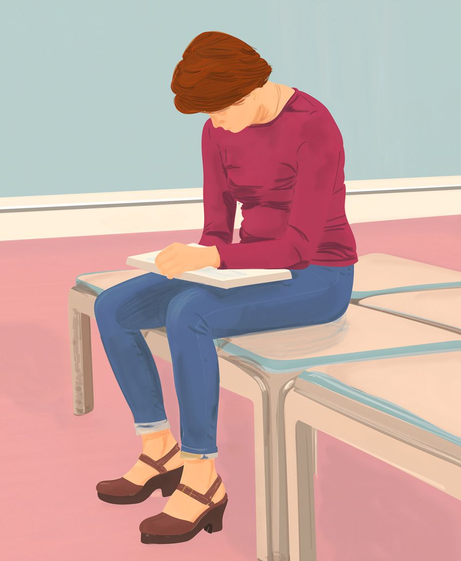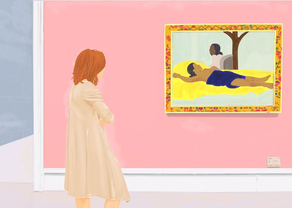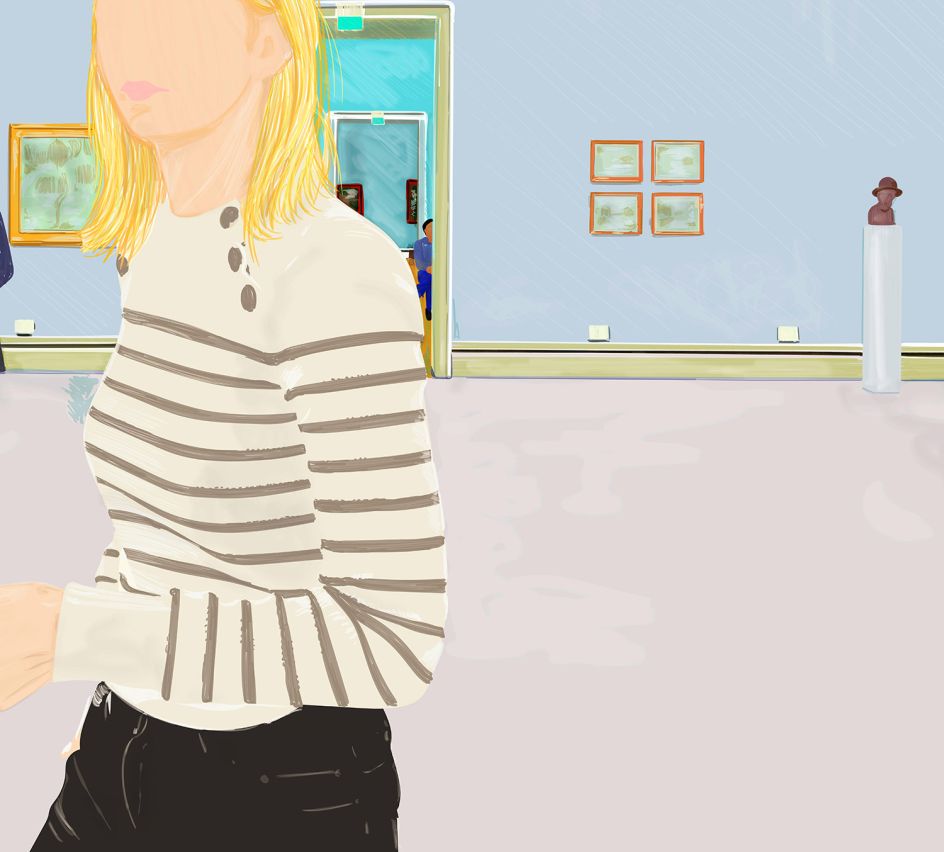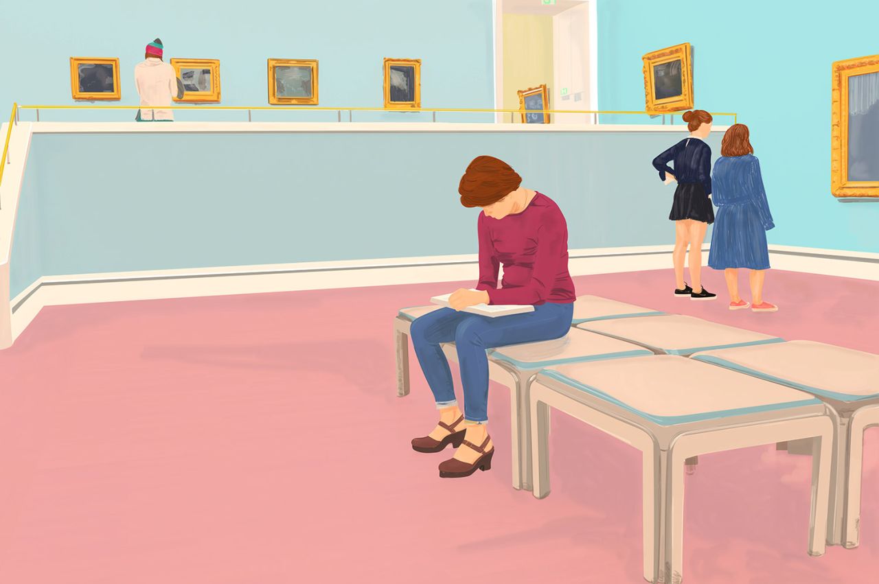 In his latest series of digital paintings, Italian artist Mario Sughi – aka nerosunero – paints brightly coloured female characters enjoying a wander around an art gallery. Entitled The Neue Pinakothek, we see women observing paintings or perhaps taking a moment to rest on a nearby bench.