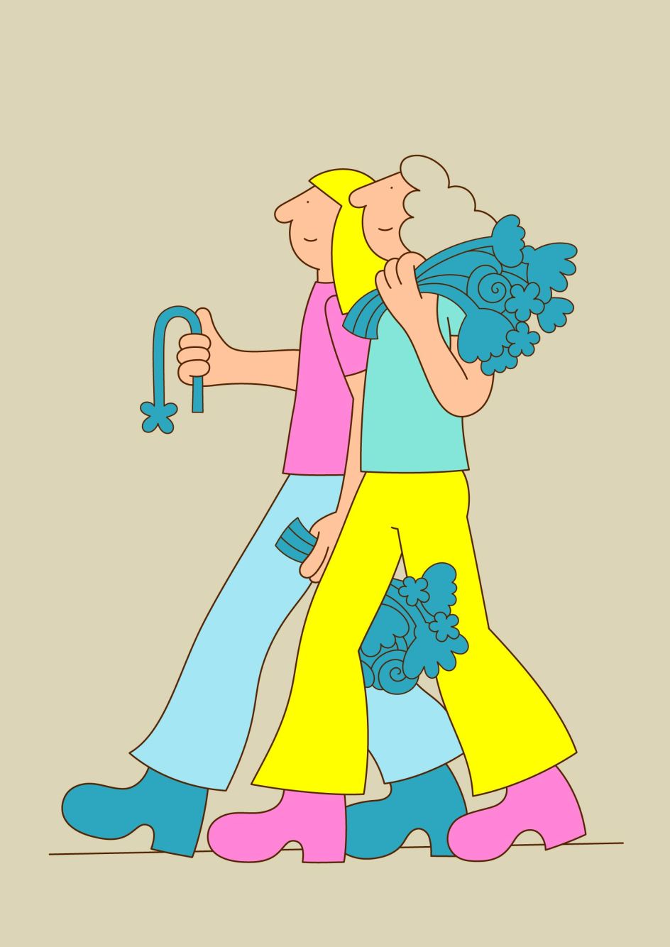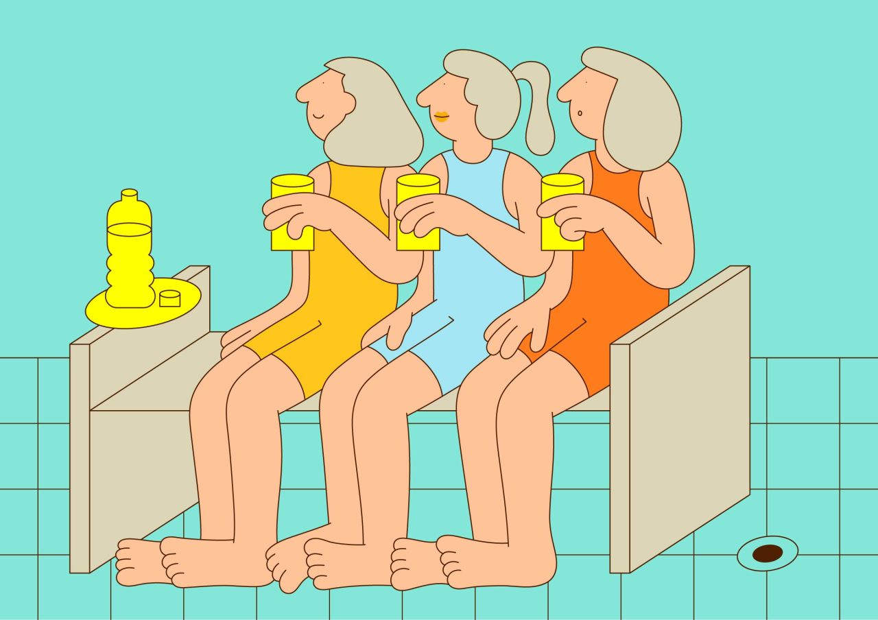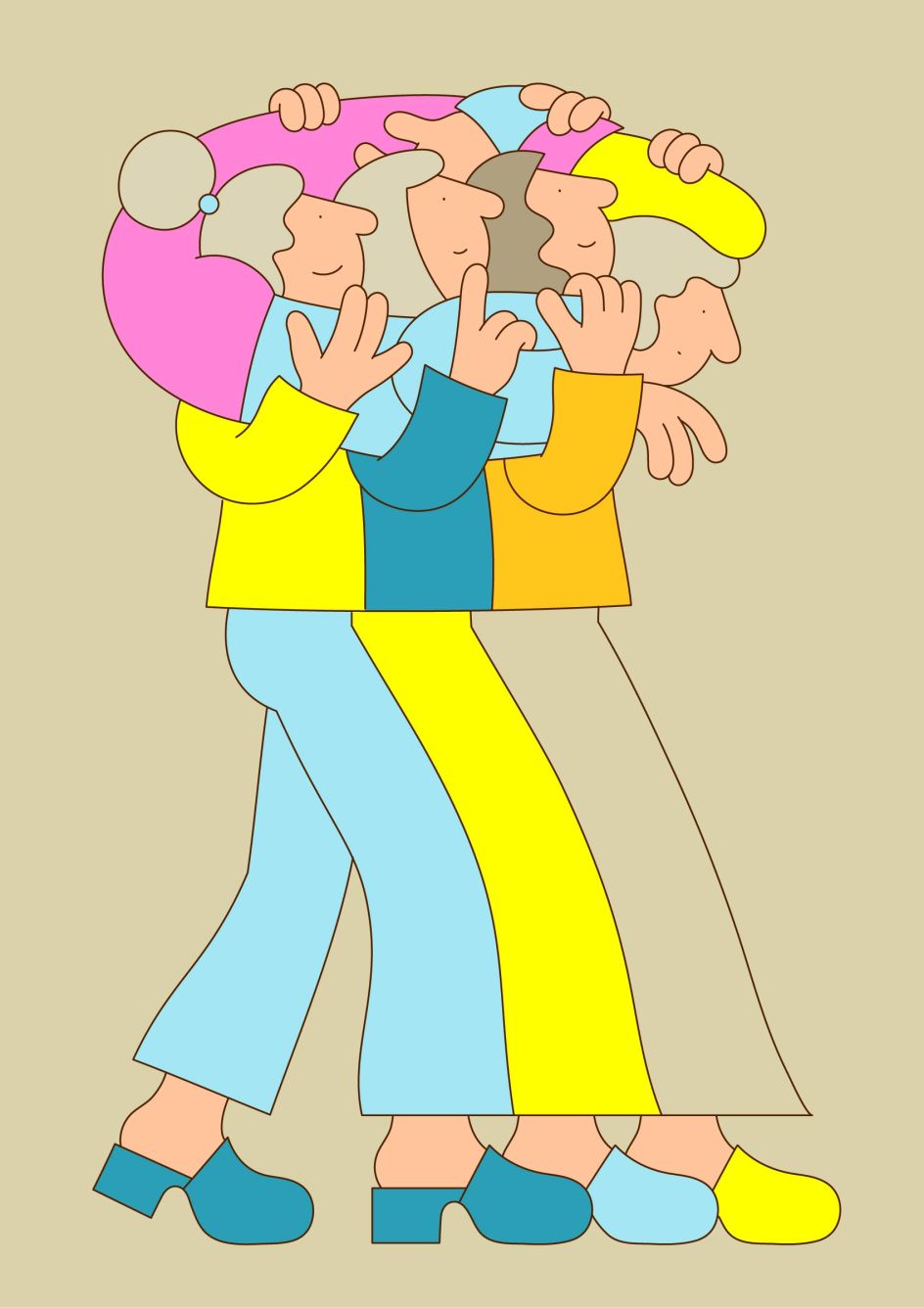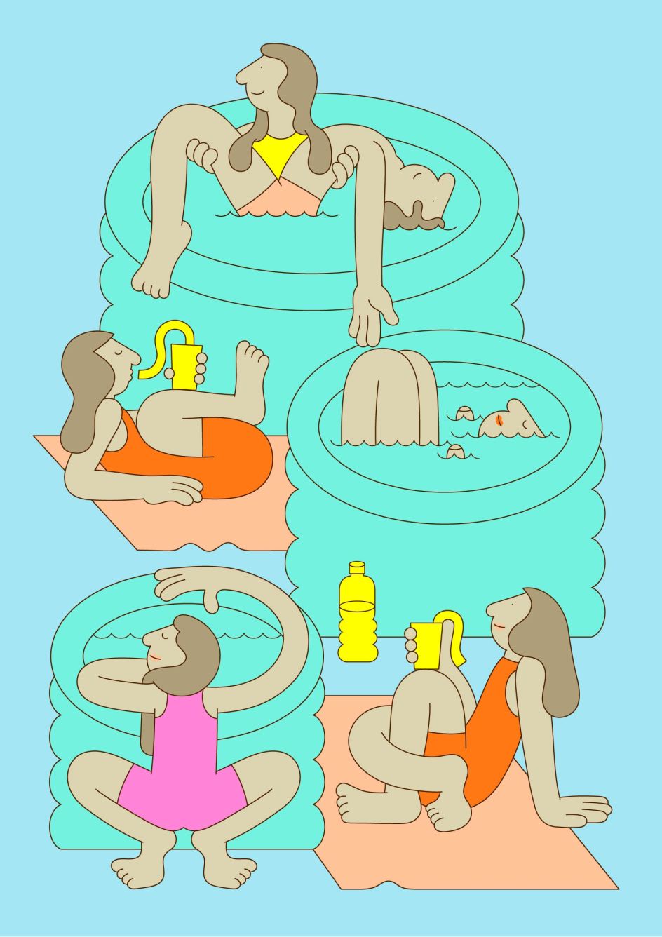 Friendships and group activities are prioritised, time alone is spent mostly to recharge. The illustrated characters are caught off-guard and are socially and carnally hungry. Playful, unsupervised and touchy, they lounge, they gawk, they provoke: the post-pandemic tactility has arrived. Stresses and the heartbreaks of the past 14 months are covered with a layer of sweaty play. The heat is on.