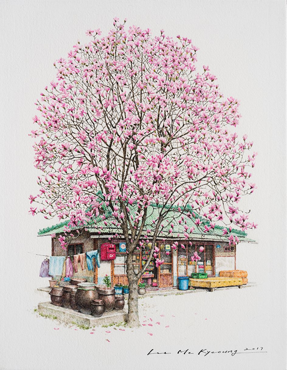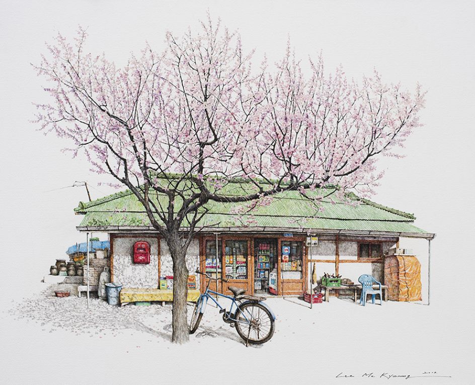 Often including the surrounding nature of each building she depicts, Me Kyeoung Lee also picks out every tiny detail you can imagine – from the signage and products on display in each window to little bicycles leaning against their fronts. Discover more of her beautiful artworks on www.leemk.com.