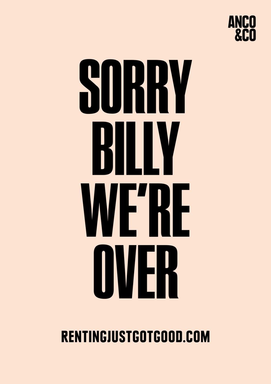 Much of the messaging is explicit – "There’s a new landlord in town", "Renting just got good" – but some is implicit. Signs with slogans like "Sorry Billy, we’re over" are intentionally abstract, but will appeal to renters sick of dragging Billy bookshelves from flat to flat (it also nods to the fact Anco&co apartments are fully furnished).