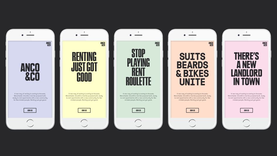 "There’s a big gap between Anco&co and what many people regard as ‘typical’ renting," says Mark Davis, co-founder and creative director of me&dave. "Our challenge was to make it clear that the two are poles apart. Build-to-rent is a bit misunderstood. Our bold campaign reframes renting as being more like belonging to a members’ club and, along the way, hopefully we crush a few stereotypes and make people smile. Real estate can take itself far too seriously sometimes."