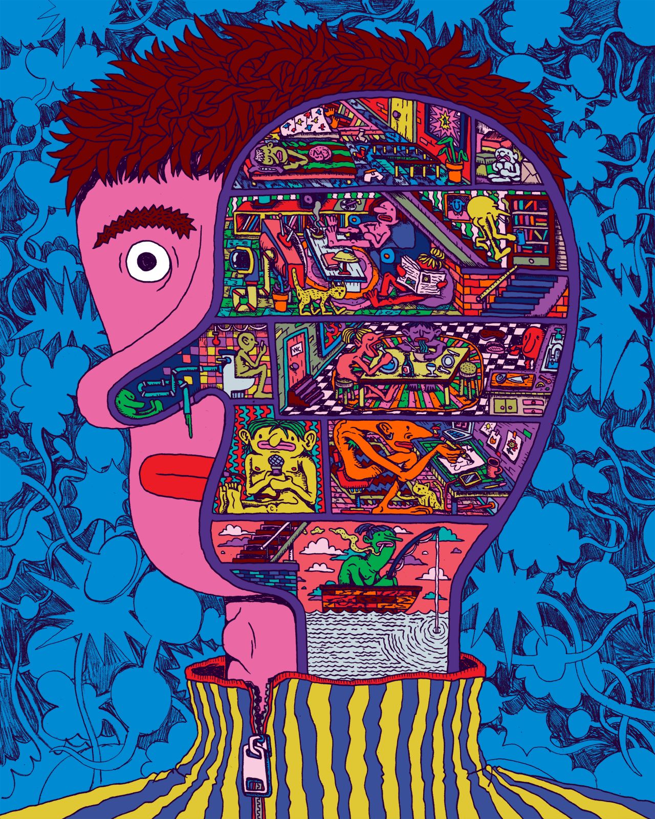 "Within the piece, I try to avoid elements with the same colour touching each other, which really makes the work one big puzzle where I have to fit all the right elements together. If the colouring is done analogy, the process is simpler. I already drew out all the linework, so I cannot stop working on the piece just because I messed up one colour. I basically just have to make it work."