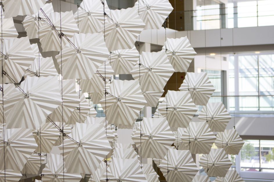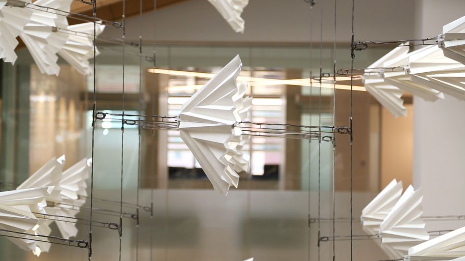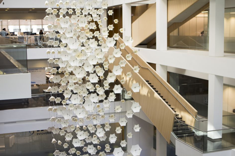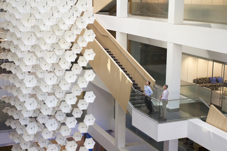 Housed in the atrium, the sculpture celebrates the organic beauty of collaboration by visualising the movements of an invisible flock of birds. Each of the four hundred elements can independently open and close, controlled by custom software running a flocking algorithm.