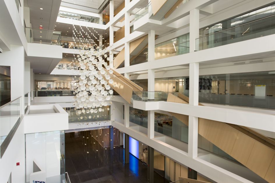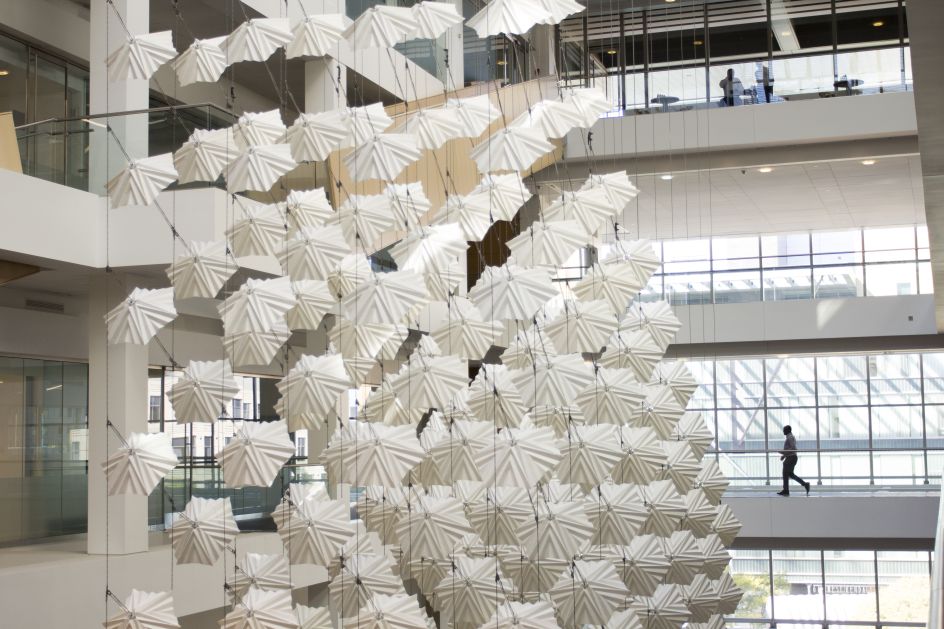 Sosolimited explains: "The sculpture reflects the collaborative and innovative spirit of the work happening in the building. The graceful breath-like movements of the piece create an open, contemplative space for all the inhabitants of the building to enjoy."
