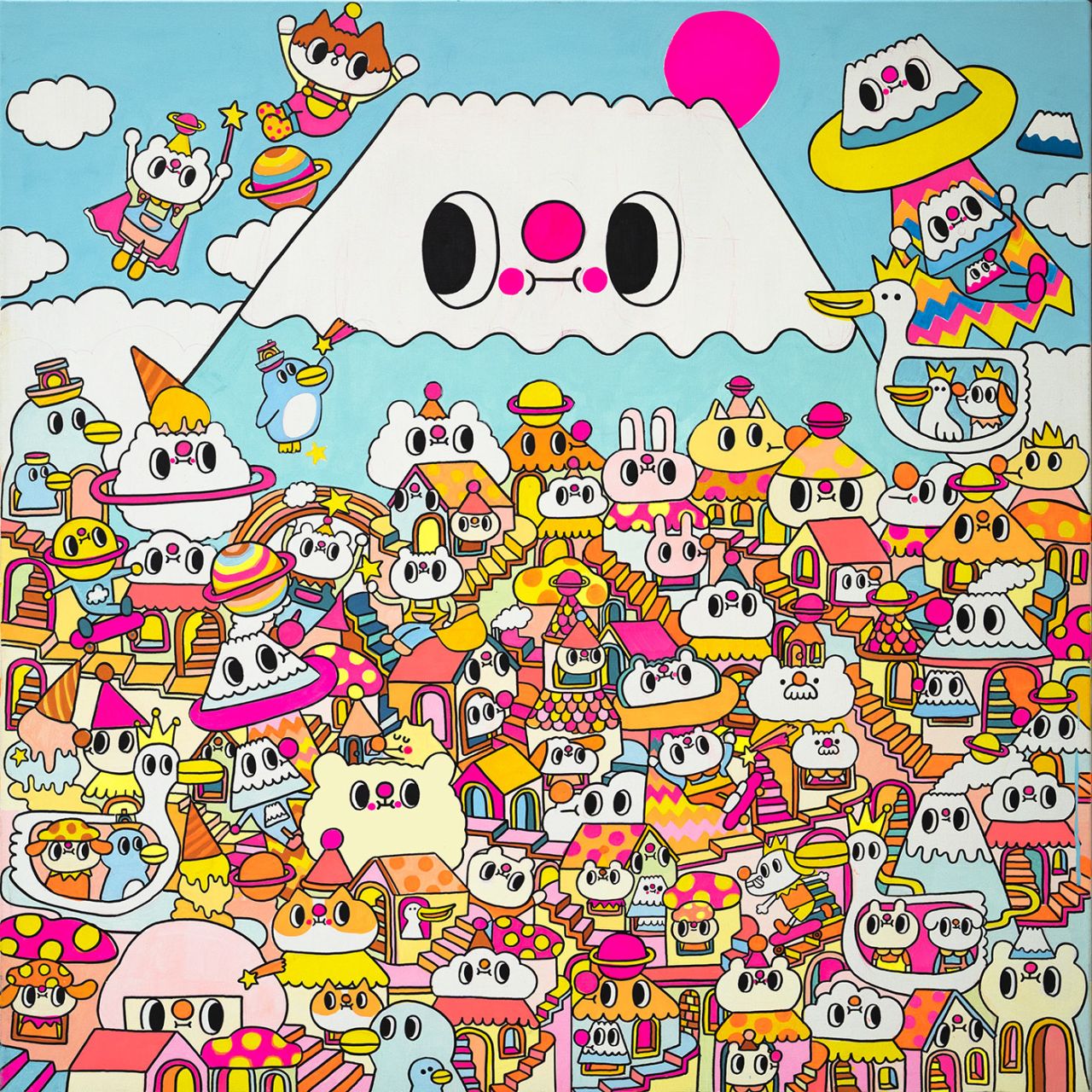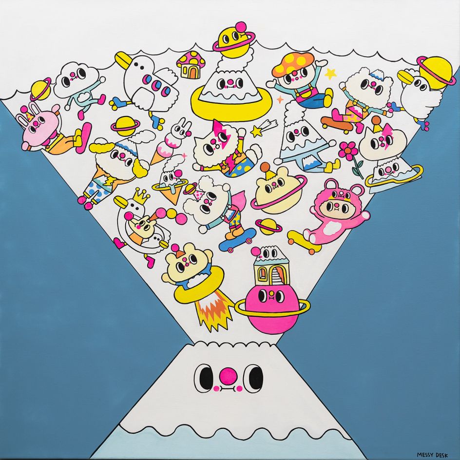 Hong Kong-based artist Messy Desk, AKA Jane Lee, loves to fill her paintings with intricate worlds. Mountains play with flying cats from outer space, a duck and a dog soar through the sky together, and even planets and volcanoes get in on the fun. It's a cute, colourful, chaotic world that has won the artist multiple awards.