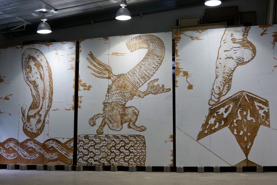 "Saturn Paintings refers to series of large, carved, and painted plywood panels," Zansky explains, "and is thus a particularly apt title for a series engaging with a cosmic scale which exceeds our comprehension and representation.