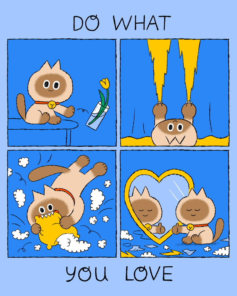 In a recent piece, the illustrator reverted to analogue processes to create a busy, pink-splashed scene involving a bunny character surrounded by shoes. "It was also a piece I completed using a ballpoint pen, which I haven't done in a while," she says. "It was fun to use traditional mediums after working so much digitally." Another project sees Min illustrating a piece for Cards Against Humanity, bringing her ideas to life via bubbly characters. Elsewhere, one particular illustration – and one of her personal favourites – depicts two cats on a date, which she says "evolved unexpectedly". She adds, "I was simply doodling without much thought and then suddenly this image came to me. It's those random moments of inspiration that really hit the sweet spot for me."