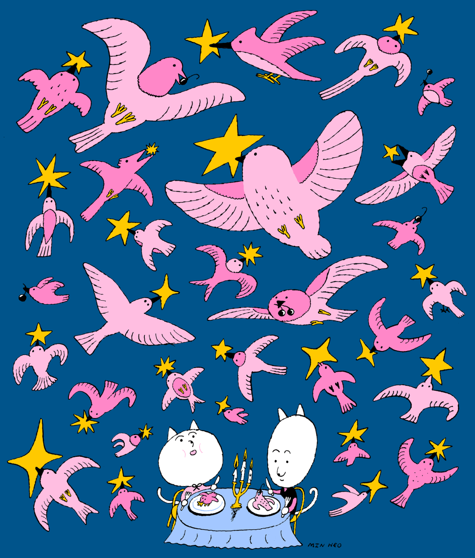 Since working as a full-time illustrator in California, Min has developed a rich artistic vision involving sweet and funny depictions of daily life – inspired moments from books, films, or things in her dad's flower garden. Everything is crafted first in her sketchbook before being brought onto the iPad. Colour and finishing touches are then drawn in either a ballpoint pen, Blackwing pencil, or dry ink brush on Procreate – but more often than not, she works digitally.