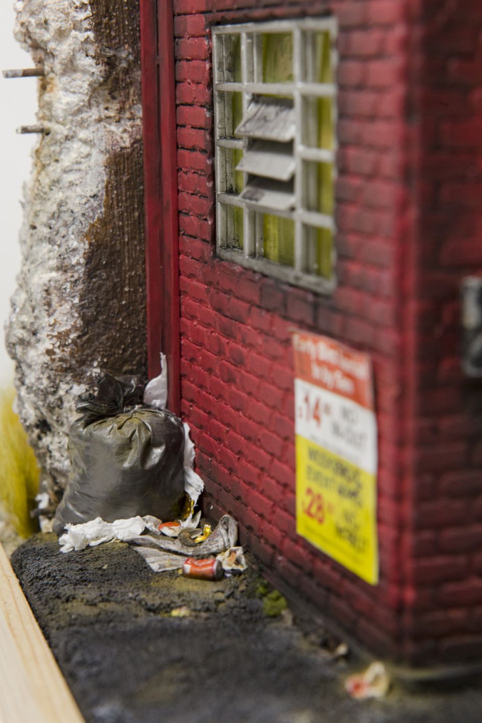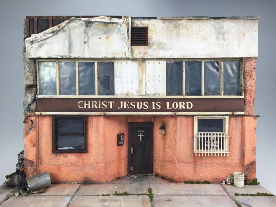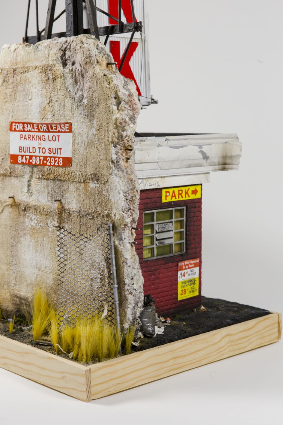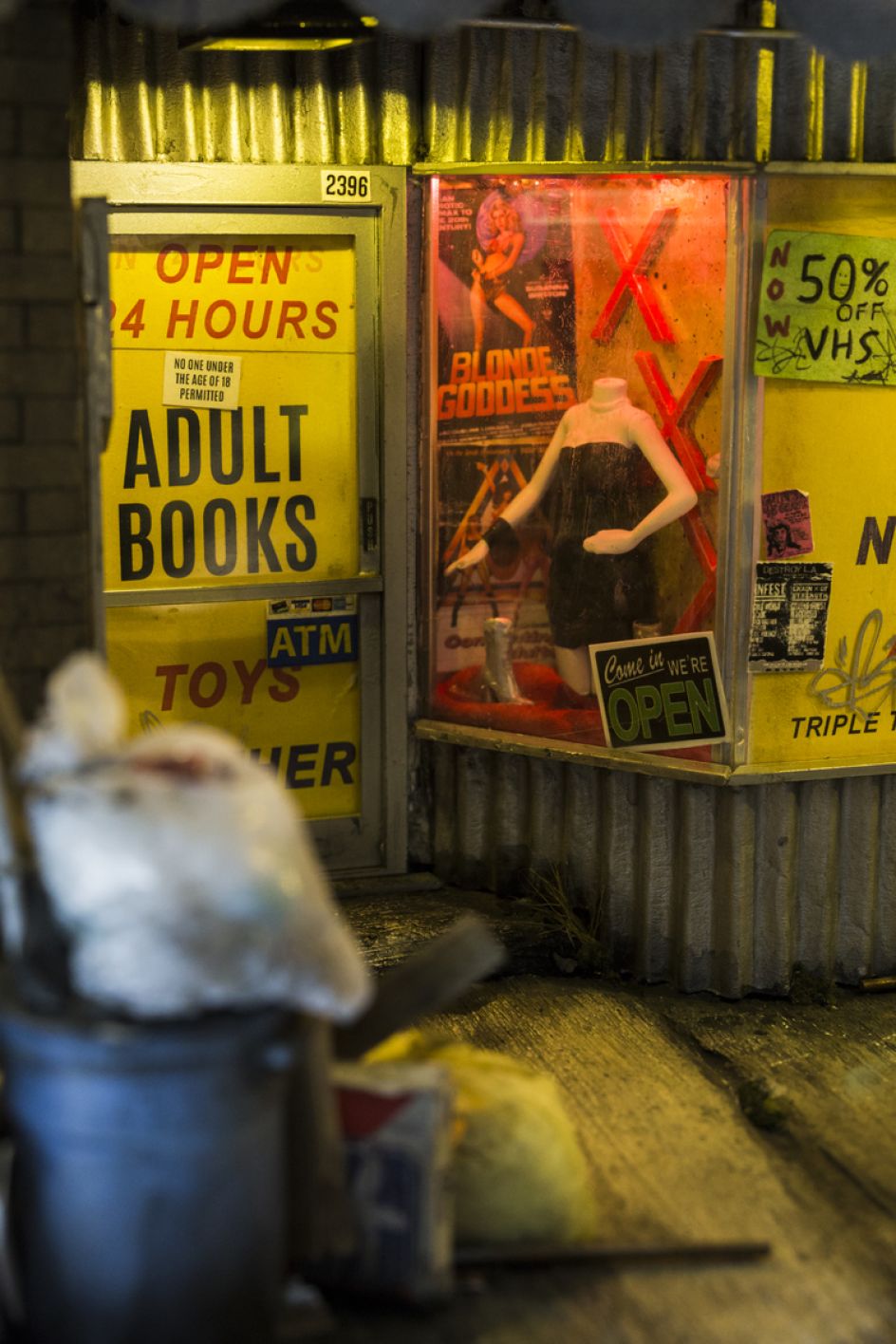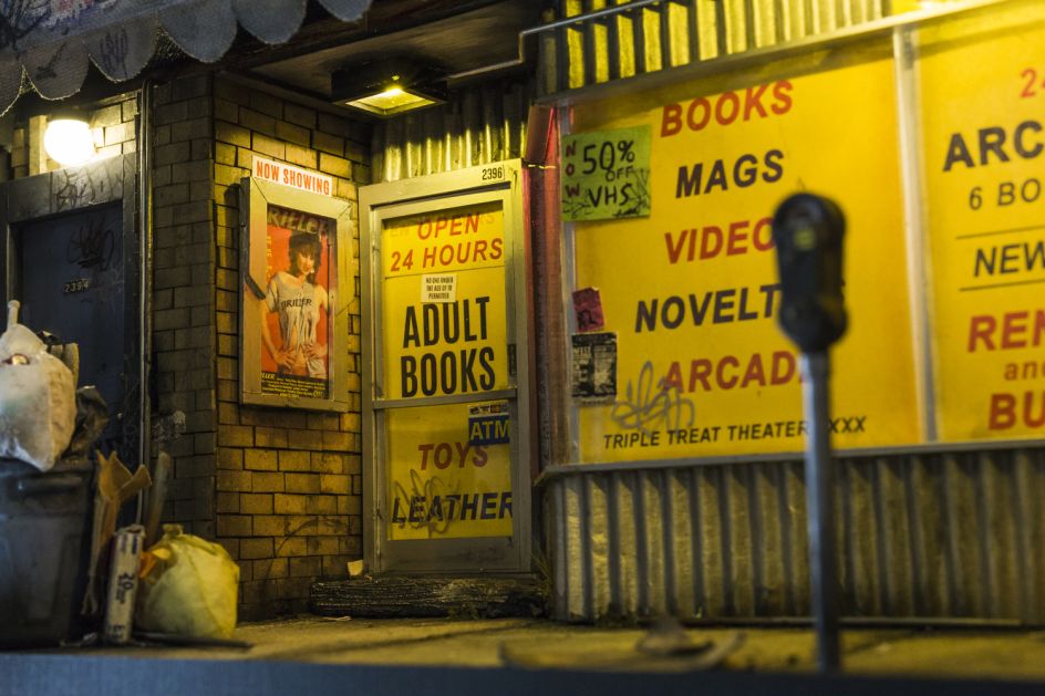 Chicago-based artist Ryan Thomas Monahan has a thing for buildings. He spends months of his time painstakingly crafting the most intricate model sculptures of porn shops, off licences, churches and convenience stores. Every detail you could possibly imagine is considered – from overflowing rubbish bins and wall-strewn graffiti to signage and lighting.