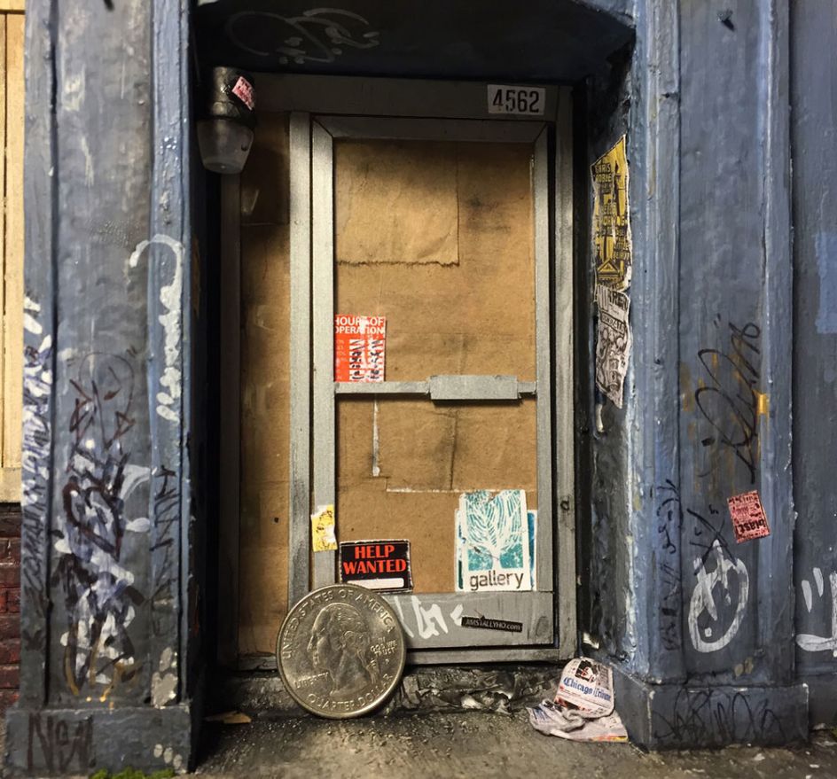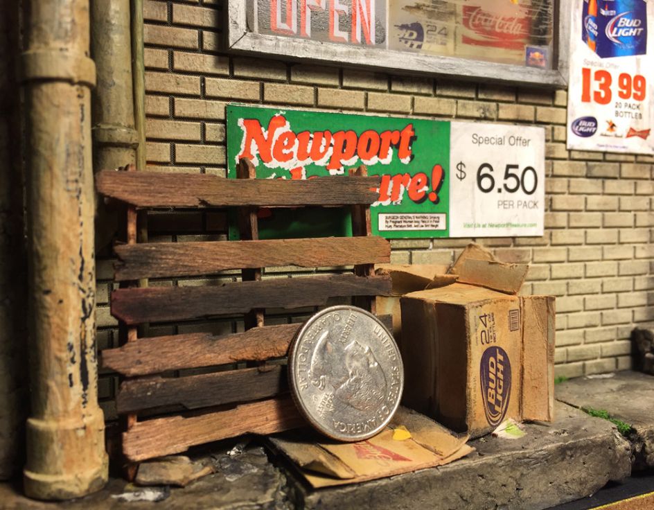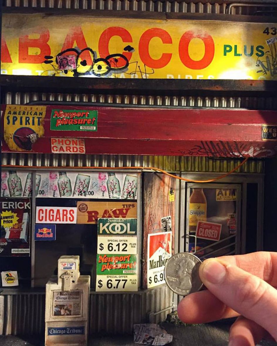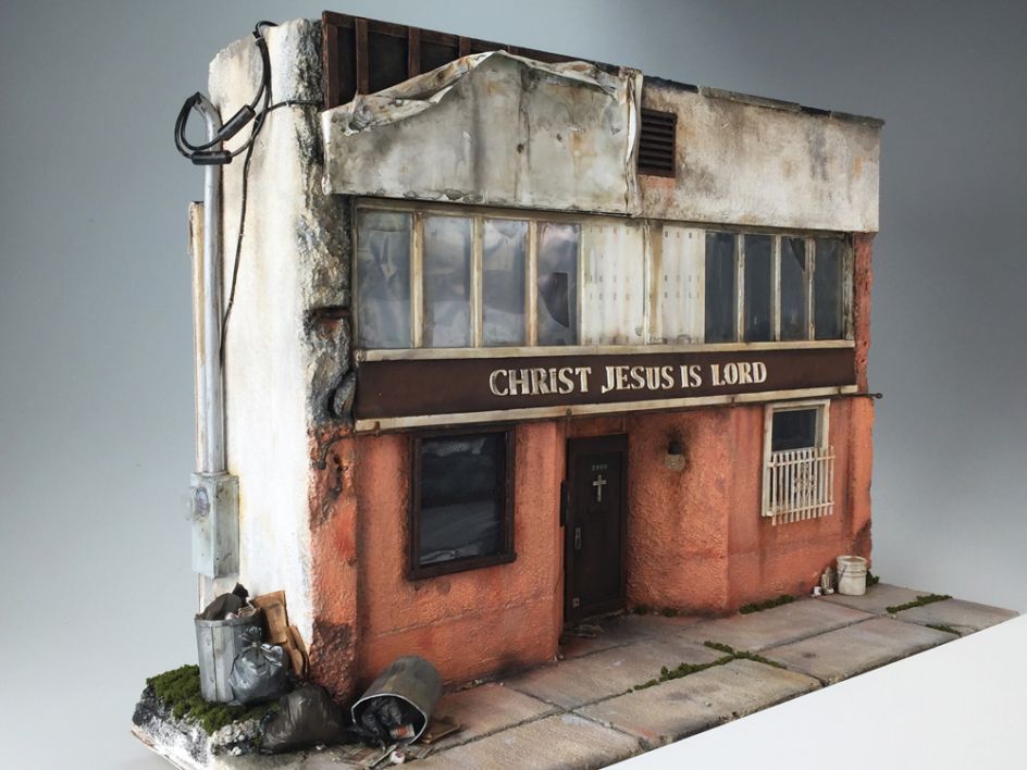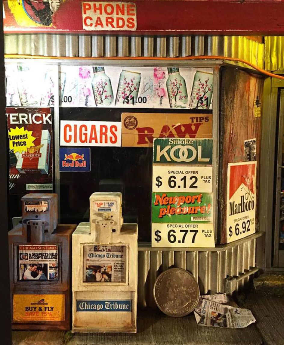 Chicago-based artist Ryan Thomas Monahan has a thing for buildings. He spends months of his time painstakingly crafting the most intricate model sculptures of porn shops, off licences, churches and convenience stores. Every detail you could possibly imagine is considered – from overflowing rubbish bins and wall-strewn graffiti to signage and lighting.